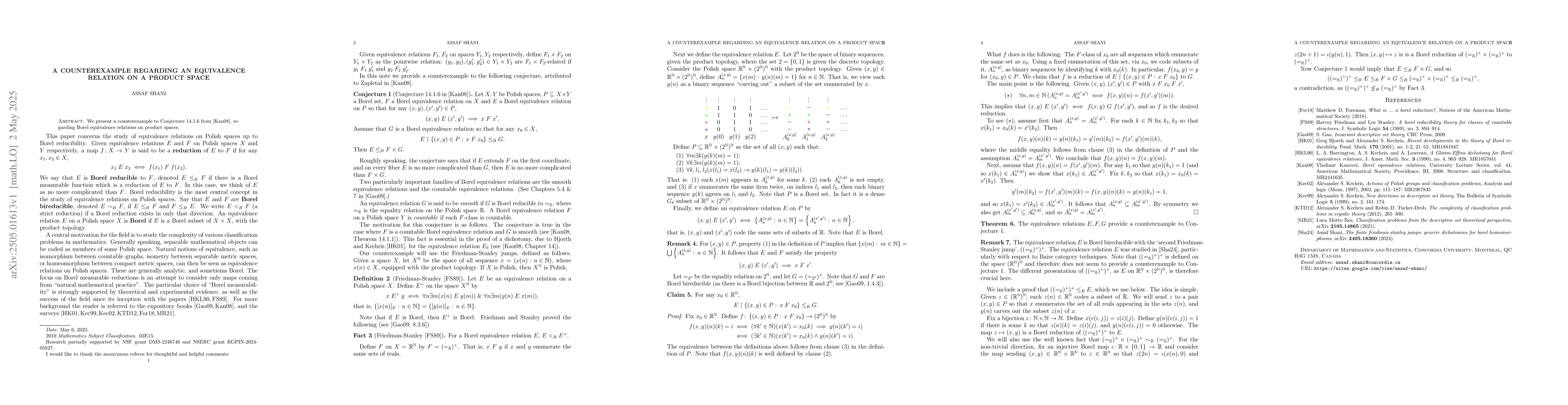 The paper presents a counterexample to Conjecture 14.1.6 from [Vladimir Kanovei, Borel equivalence relations], utilizing Friedman-Stanley jumps and properties of Borel equivalence relations on product spaces.