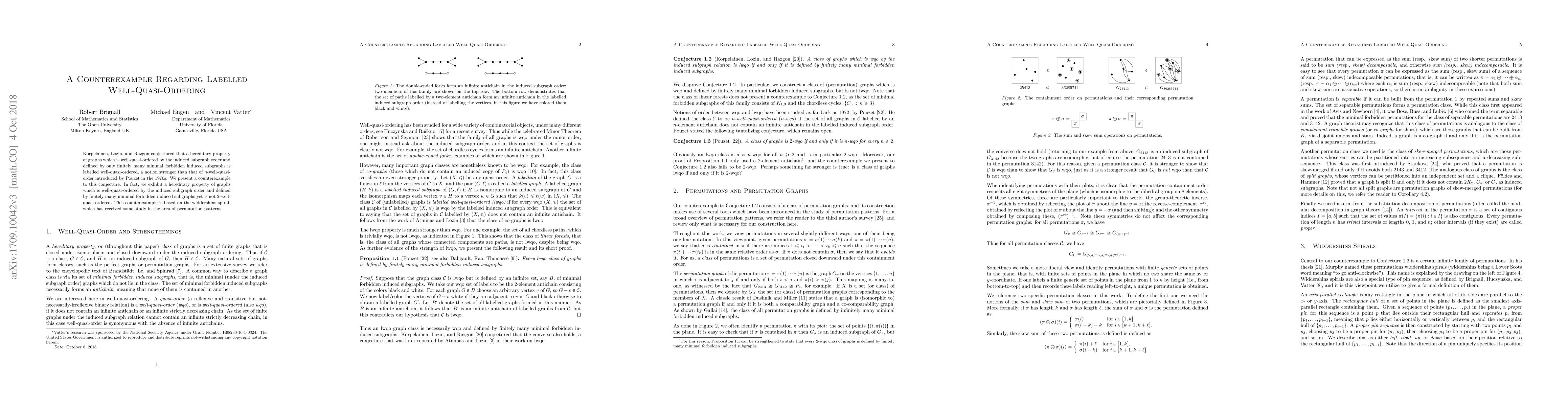 Korpelainen, Lozin, and Razgon conjectured that a hereditary property of graphs which is well-quasi-ordered by the induced subgraph order and defined by only finitely many minimal forbidden induced subgraphs is labelled well-quasi-ordered, a notion stronger than that of $n$-well-quasi-order introduced by Pouzet in the 1970s. We present a counterexample to this conjecture. In fact, we exhibit a hereditary property of graphs which is well-quasi-ordered by the induced subgraph order and defined by finitely many minimal forbidden induced subgraphs yet is not $2$-well-quasi-ordered. This counterexample is based on the widdershins spiral, which has received some study in the area of permutation patterns.
