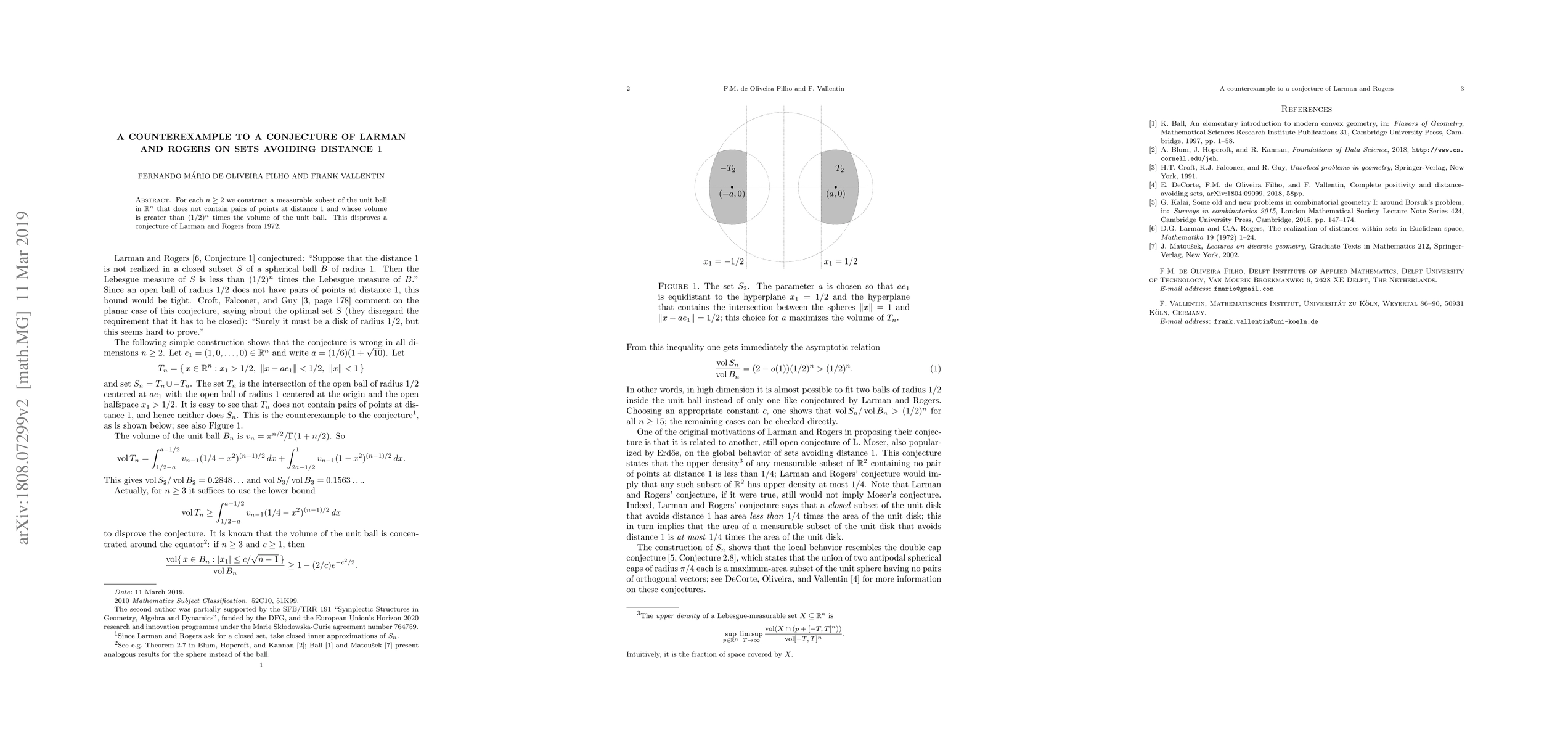 For $n \geq 2$ we construct a measurable subset of the unit ball in $\mathbb{R}^n$ that does not contain pairs of points at distance 1 and whose volume is greater than $(1/2)^n$ times the volume of the ball. This disproves a conjecture of Larman and Rogers from 1972.