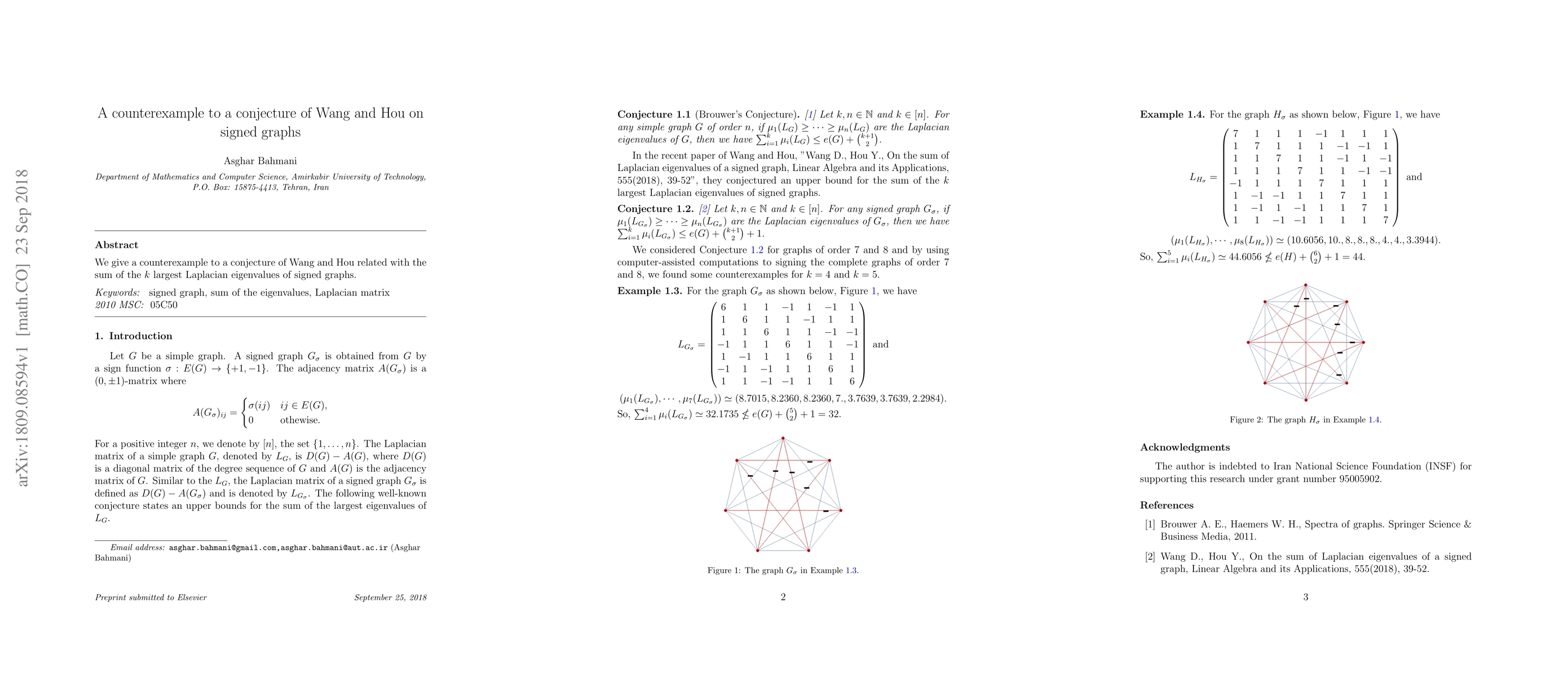 Summary: This paper refutes a conjecture by Wang and Hou concerning the sum of the $k$ largest Laplacian eigenvalues in signed graphs, presenting a specific counterexample.