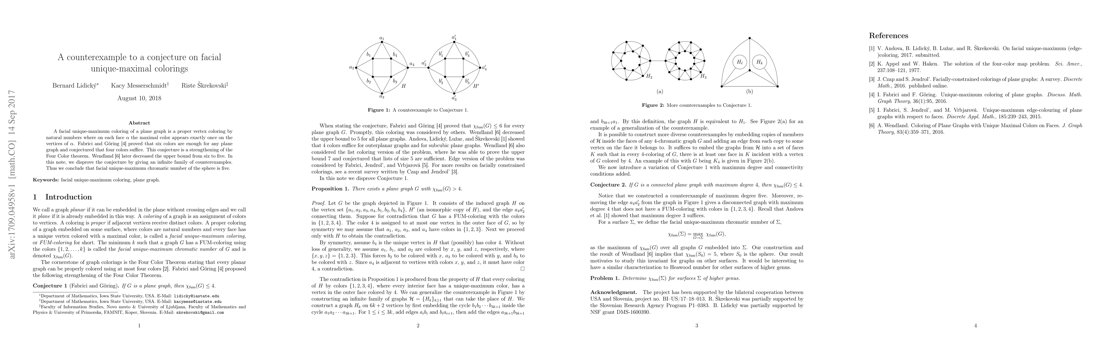 This paper disproves the conjecture that four colors suffice for facial unique-maximum colorings of plane graphs, providing an infinite family of counterexamples. It concludes that the facial unique-maximum chromatic number of the sphere is five.