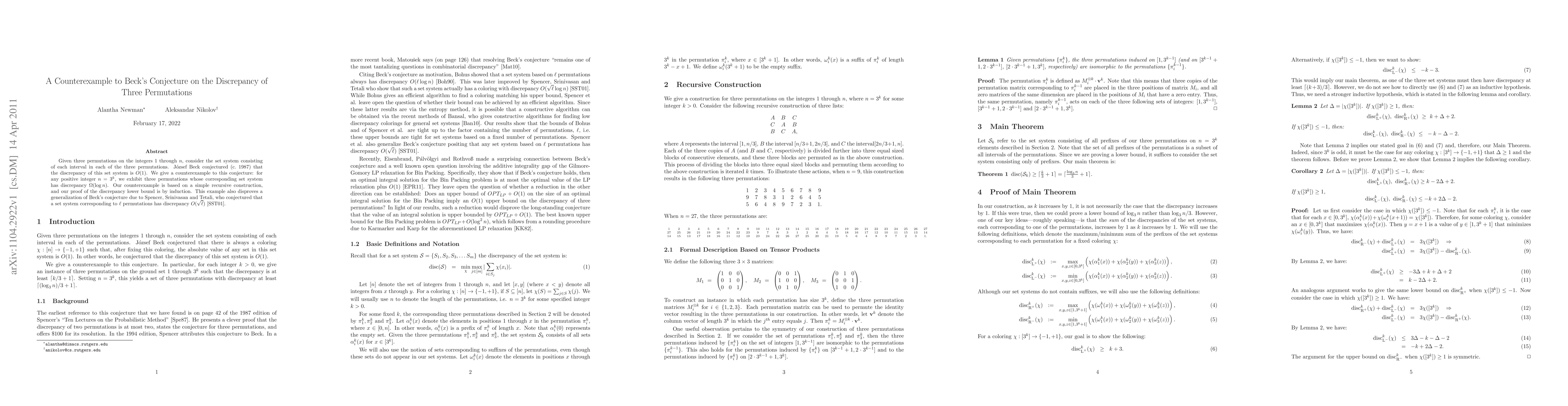 This paper presents a counterexample disproving Beck's conjecture and a generalization by Spencer, Srinivasan, and Tetali. For any power of three (n = 3^k), it exhibits three permutations whose set system, derived from intervals in these permutations, has a discrepancy of Omega(log(n)). The construction is recursive, and the proof uses mathematical induction.