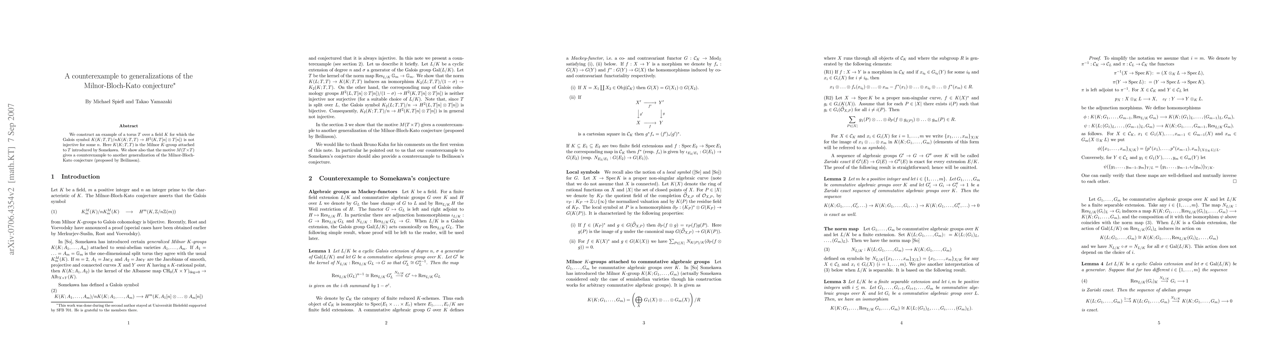 This paper presents a counterexample to generalizations of the Milnor-Bloch-Kato conjecture by constructing a torus $T$ over a field $K$ where the Galois symbol map fails to be injective for certain $n$. It also demonstrates that the motive $M(T\times T)$ contradicts another proposed generalization by Beilinson.