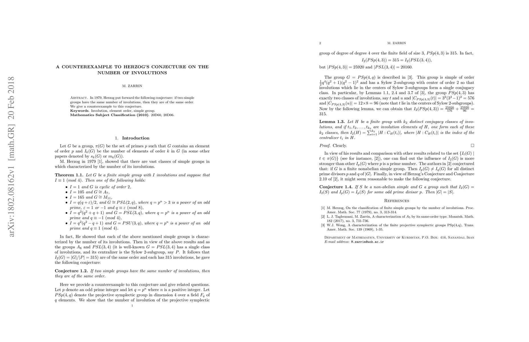 Summary: This paper refutes Herzog's 1979 conjecture that simple groups with the same number of involutions must have the same order, presenting a counterexample to demonstrate the conjecture's invalidity.