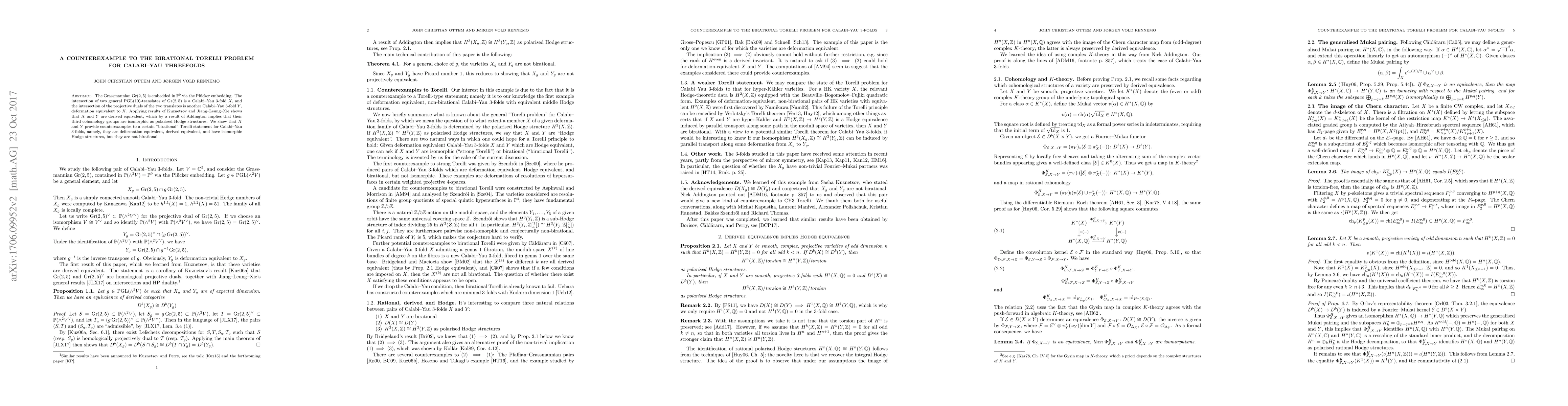 The paper presents a counterexample to the birational Torelli problem for Calabi-Yau threefolds, showing that two such threefolds, derived equivalent and with isomorphic Hodge structures, are not birational. Specifically, it uses the intersection of PGL(10)-translates of the Grassmannian Gr(2,5) embedded in $\Bbb{P}^9$.