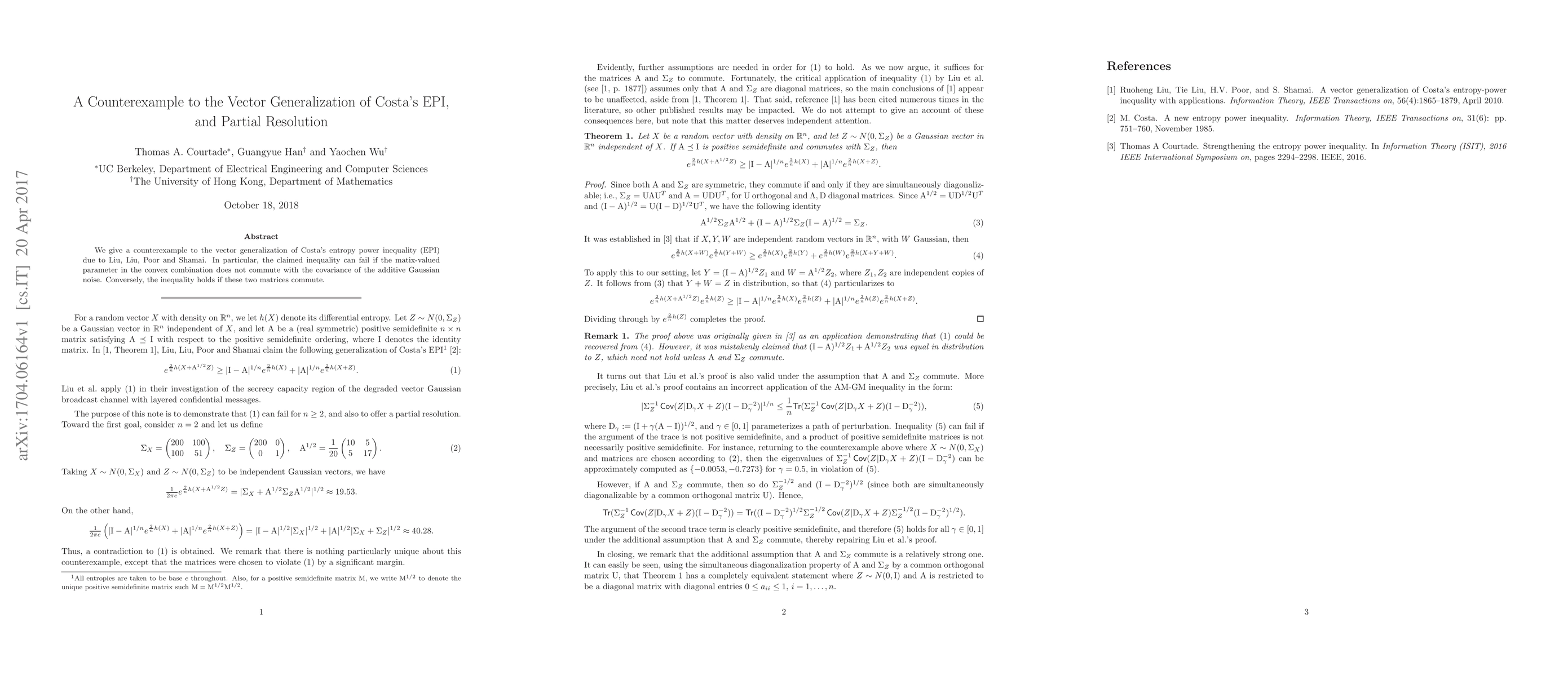 Summary: This paper presents a counterexample showing that the vector generalization of Costa's entropy power inequality fails when the matrix-valued parameter in the convex combination does not commute with the noise covariance matrix. Conversely, the inequality holds if these matrices commute.