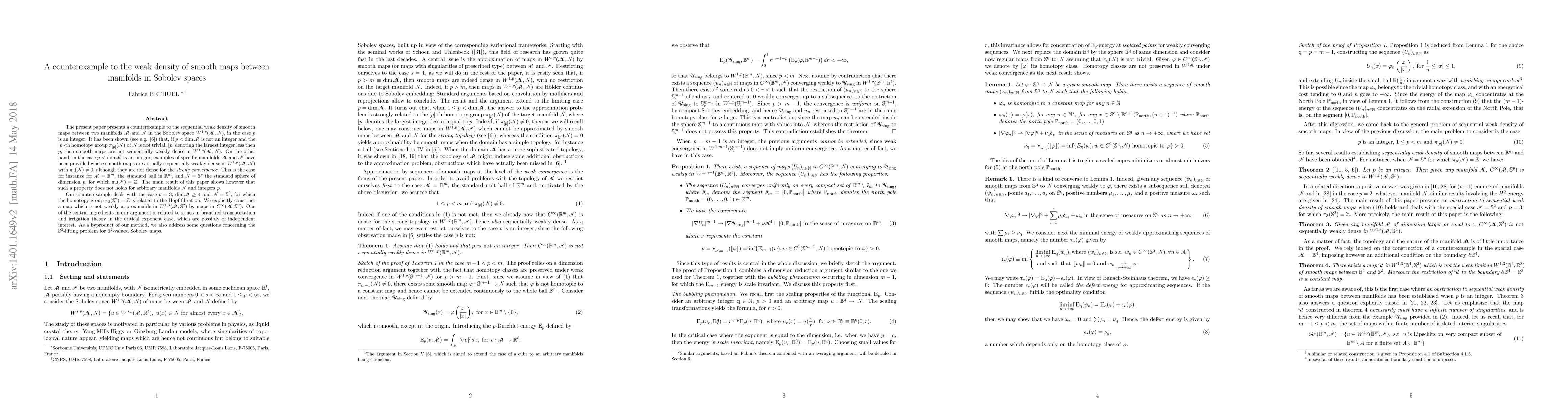 This research paper presents a counterexample disproving the sequential weak density of smooth maps between manifolds in Sobolev spaces for integer values of 'p'. It highlights that for non-integer 'p' less than manifold dimension and non-trivial '[p]'-th homotopy groups, smooth maps aren't sequentially weakly dense. Contrarily, for integer 'p', examples exist where smooth maps are sequentially weakly dense in certain cases like M being a ball and N being a sphere. The main finding is a counterexample for p=3, dim M ≥ 4, and N = S^2, utilizing the Hopf fibration.