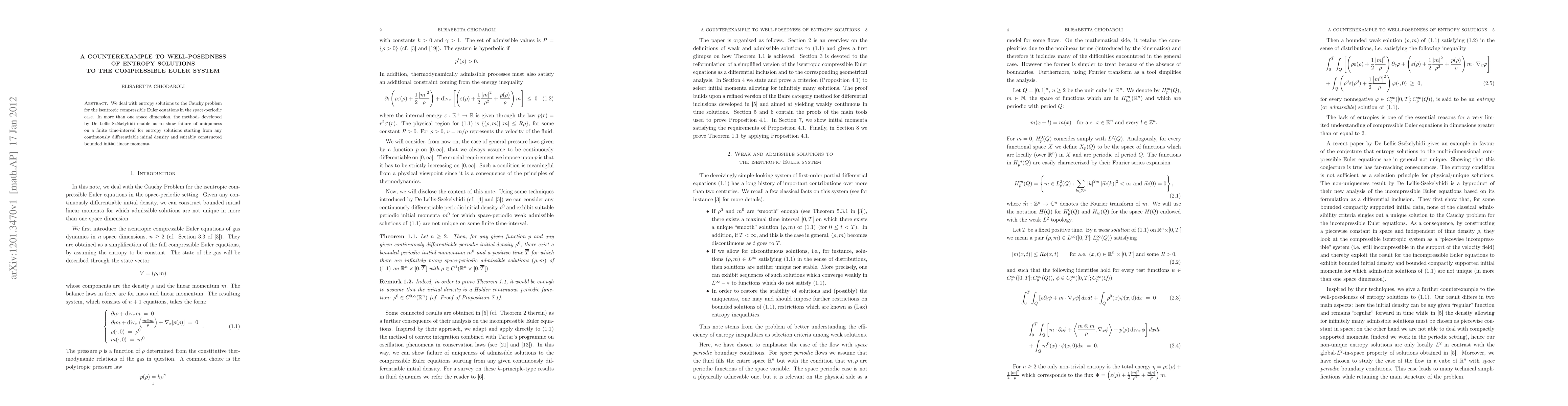 This paper presents a counterexample demonstrating the failure of uniqueness for entropy solutions to the isentropic compressible Euler equations in multiple dimensions, using methods developed by De Lellis and Sz\'ekelyhidi. It shows that solutions can diverge from any continuously differentiable initial density under specific conditions.