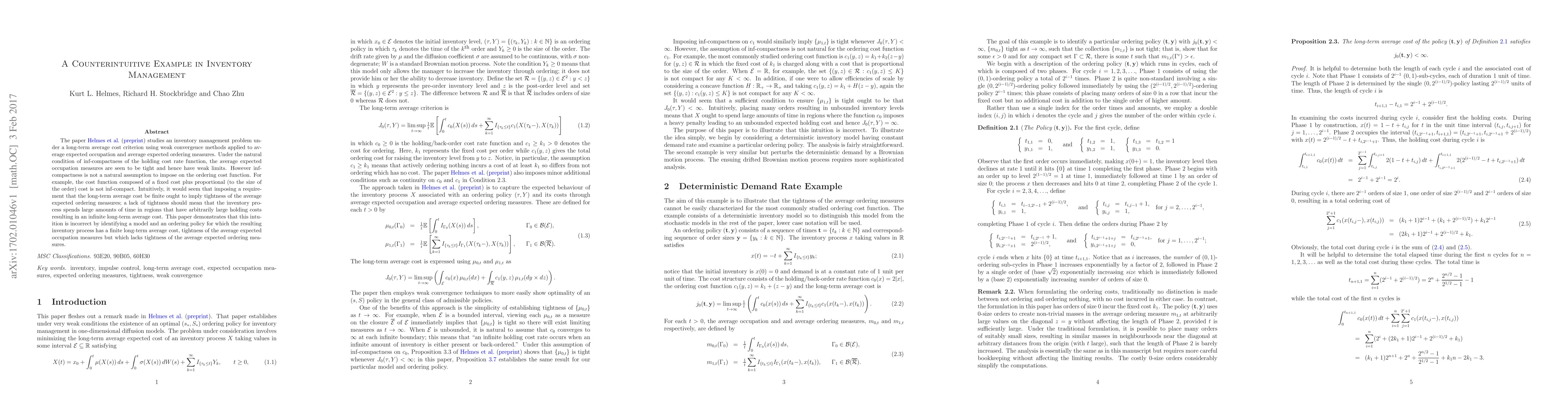The paper \cite{helm:17} studies an inventory management problem under a long-term average cost criterion using weak convergence methods applied to average expected occupation and average expected ordering measures. Under the natural condition of inf-compactness of the holding cost rate function, the average expected occupation measures are seen to be tight and hence have weak limits. However inf-compactness is not a natural assumption to impose on the ordering cost function. For example, the cost function composed of a fixed cost plus proportional (to the size of the order) cost is not inf-compact. Intuitively, it would seem that imposing a requirement that the long-term average cost be finite ought to imply tightness of the average expected ordering measures; a lack of tightness should mean that the inventory process spends large amounts of time in regions that have arbitrarily large holding costs resulting in an infinite long-term average cost. This paper demonstrates that this intuition is incorrect by identifying a model and an ordering policy for which the resulting inventory process has a finite long-term average cost, tightness of the average expected occupation measures but which lacks tightness of the average expected ordering measures.