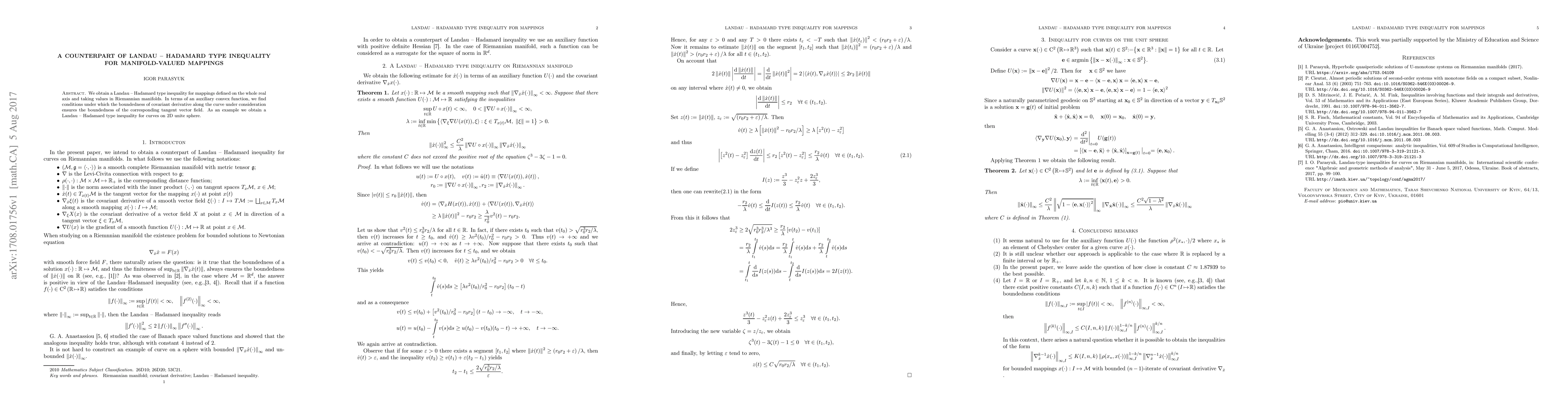 We obtain a Landau -- Hadamard type inequality for mappings defined on the whole real axis and taking values in Riemannian manifolds. In terms of an auxiliary convex function, we find conditions under which the boundedness of covariant derivative along the curve under consideration ensures the boundedness of the corresponding tangent vector field. As an example we obtain a Landau -- Hadamard type inequality for curves on 2D unite sphere.