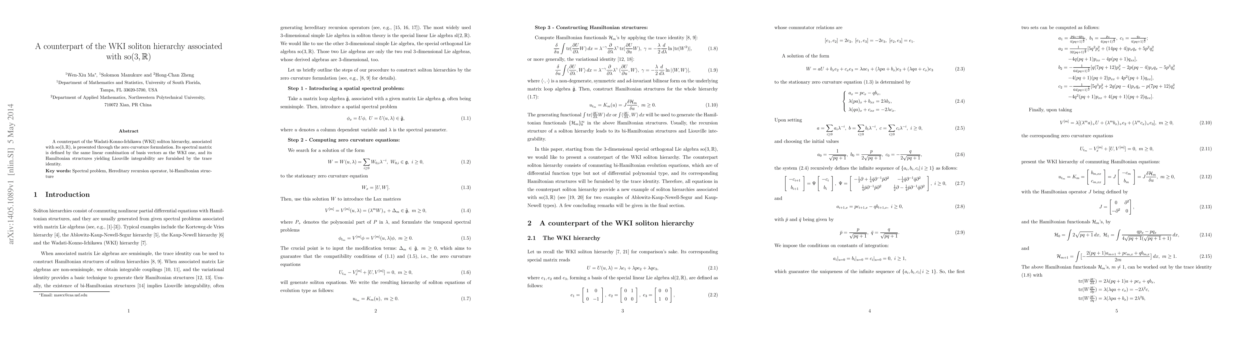 A counterpart of the Wadati-Konno-Ichikawa (WKI) soliton hierarchy, associated with so(3,R), is presented through the zero curvature formulation. Its spectral matrix is defined by the same linear combination of basis vectors as the WKI one, and its Hamiltonian structures yielding Liouville integrability are furnished by the trace identity.