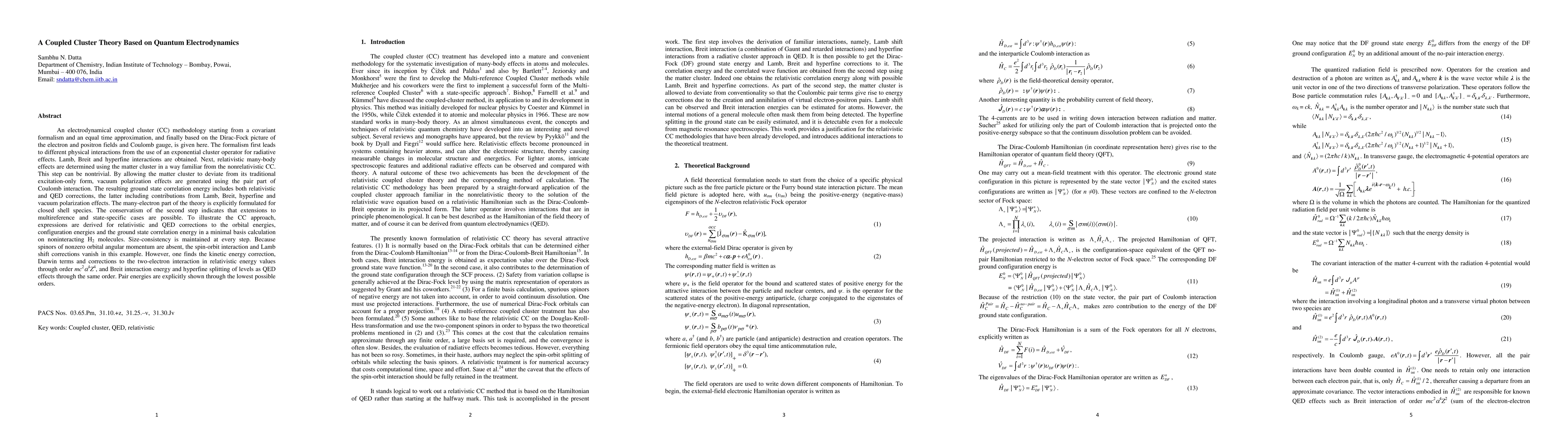 This paper presents a coupled cluster theory based on quantum electrodynamics (QED), derived from a covariant formalism and equal time approximation. It introduces a cluster operator for radiative effects, capturing Lamb, Breit, and hyperfine interactions. The method extends to relativistic many-body effects and vacuum polarization, formulated for closed-shell species. The approach is demonstrated with relativistic and QED correction expressions for noninteracting H2 molecules, maintaining size-consistency and illustrating corrections like kinetic energy, Darwin terms, Breit interaction, and hyperfine splitting.
