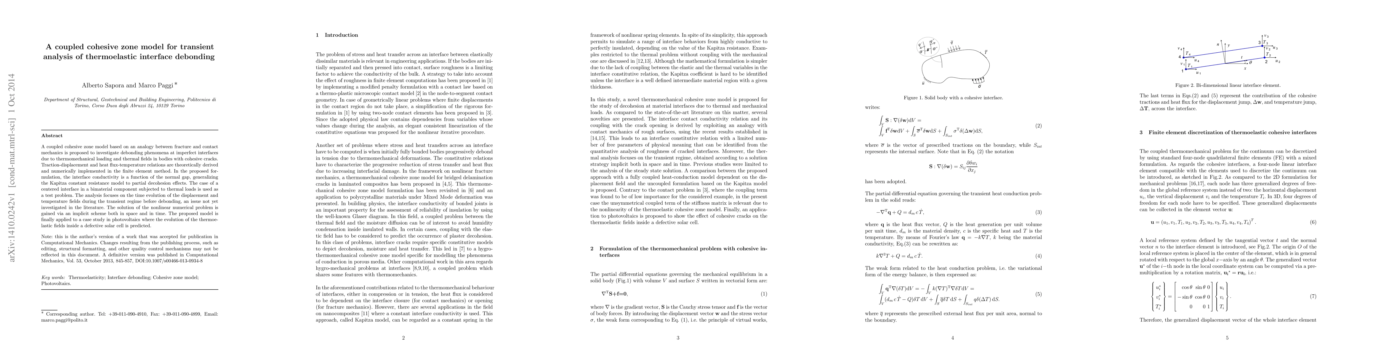 A coupled cohesive zone model based on an analogy between fracture and contact mechanics is proposed to investigate debonding phenomena at imperfect interfaces due to thermomechanical loading and thermal fields in bodies with cohesive cracks. Traction-displacement and heat flux-temperature relations are theoretically derived and numerically implemented in the finite element method. In the proposed formulation, the interface conductivity is a function of the normal gap, generalizing the Kapitza constant resistance model to partial decohesion effects. The case of a centered interface in a bimaterial component subjected to thermal loads is used as a test problem. The analysis focuses on the time evolution of the displacement and temperature fields during the transient regime before debonding, an issue not yet investigated in the literature. The solution of the nonlinear numerical problem is gained via an implicit scheme both in space and in time. The proposed model is finally applied to a case study in photovoltaics where the evolution of the thermoelastic fields inside a defective solar cell is predicted.
