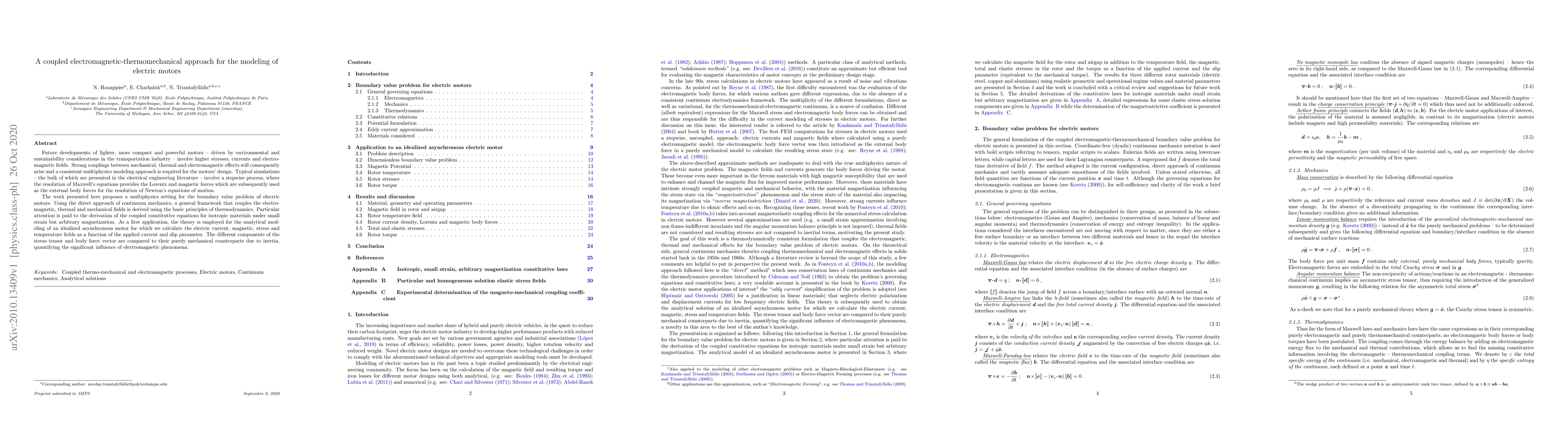 Future developments of lighter, more compact and powerful motors-driven by environmental and sustainability considerations in the transportation industry-involve higher stresses, currents and electromagnetic fields. Strong couplings between mechanical, thermal and electromagnetic effects will consequently arise and a consistent multiphysics modeling approach is required for the motors' design. Typical simulations-the bulk of which are presented in the electrical engineering literature-involve a stepwise process, where the resolution of Maxwell's equations provides the Lorentz and magnetic forces which are subsequently used as the external body forces for the resolution of Newton's equations of motion. The work presented here proposes a multiphysics setting for the boundary value problem of electric motors. Using the direct approach of continuum mechanics, a general framework that couples the electromagnetic , thermal and mechanical fields is derived using the basic principles of thermodynamics. Particular attention is paid to the derivation of the coupled constitutive equations for isotropic materials under small strain but arbitrary magnetization. As a first application, the theory is employed for the analytical mod-eling of an idealized asynchronous motor for which we calculate the electric current, magnetic, stress and temperature fields as a function of the applied current and slip parameter. The different components of the stress tensor and body force vector are compared to their purely mechanical counterparts due to inertia, quantifying the significant influence of electromagnetic phenomena.