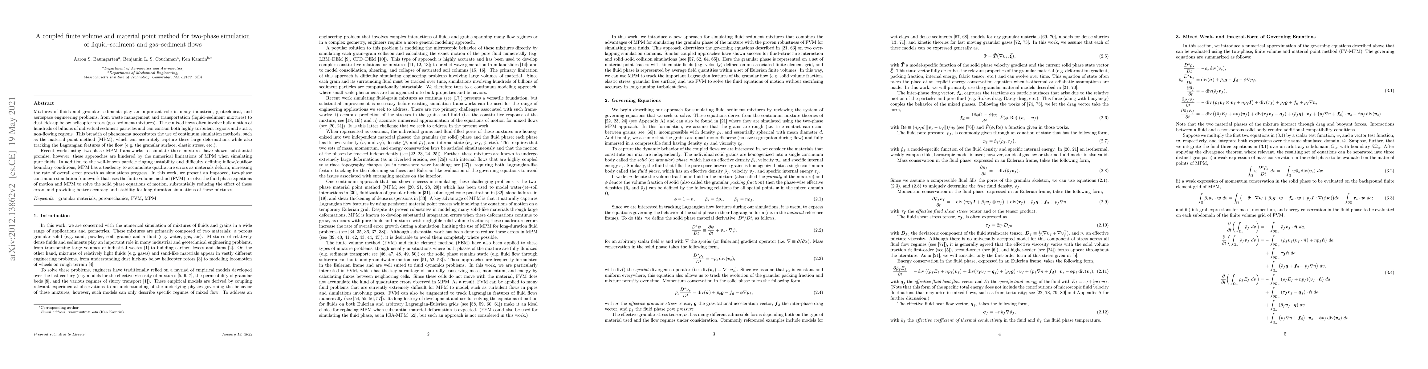 Mixtures of fluids and granular sediments play an important role in many industrial, geotechnical, and aerospace engineering problems, from waste management and transportation (liquid--sediment mixtures) to dust kick-up below helicopter rotors (gas--sediment mixtures). These mixed flows often involve bulk motion of hundreds of billions of individual sediment particles and can contain both highly turbulent regions and static, non-flowing regions. This breadth of phenomena necessitates the use of continuum simulation methods, such as the material point method (MPM), which can accurately capture these large deformations while also tracking the Lagrangian features of the flow (e.g.\ the granular surface, elastic stress, etc.). Recent works using two-phase MPM frameworks to simulate these mixtures have shown substantial promise; however, these approaches are hindered by the numerical limitations of MPM when simulating pure fluids. In addition to the well-known particle ringing instability and difficulty defining inflow/outflow boundary conditions, MPM has a tendency to accumulate quadrature errors as materials deform, increasing the rate of overall error growth as simulations progress. In this work, we present an improved, two-phase continuum simulation framework that uses the finite volume method (FVM) to solve the fluid phase equations of motion and MPM to solve the solid phase equations of motion, substantially reducing the effect of these errors and providing better accuracy and stability for long-duration simulations of these mixtures.