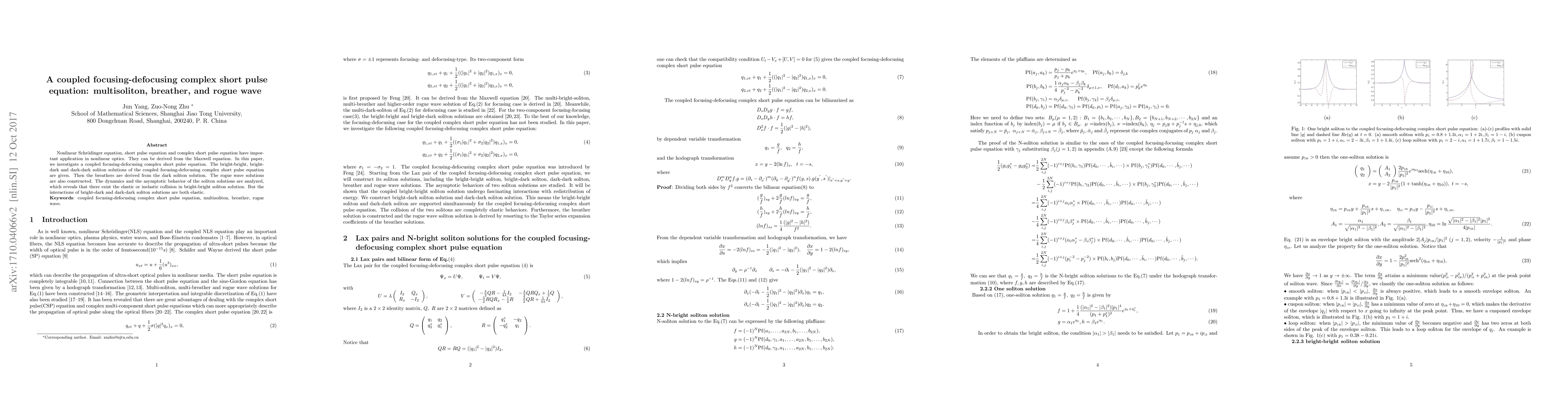 This paper explores a coupled focusing-defocusing complex short pulse equation, deriving bright-bright, bright-dark, and dark-dark soliton solutions, breathers from dark solitons, and rogue wave solutions. The study analyzes the dynamics and asymptotic behavior, revealing elastic collisions in bright-bright soliton interactions and elastic interactions in bright-dark and dark-dark soliton pairs.