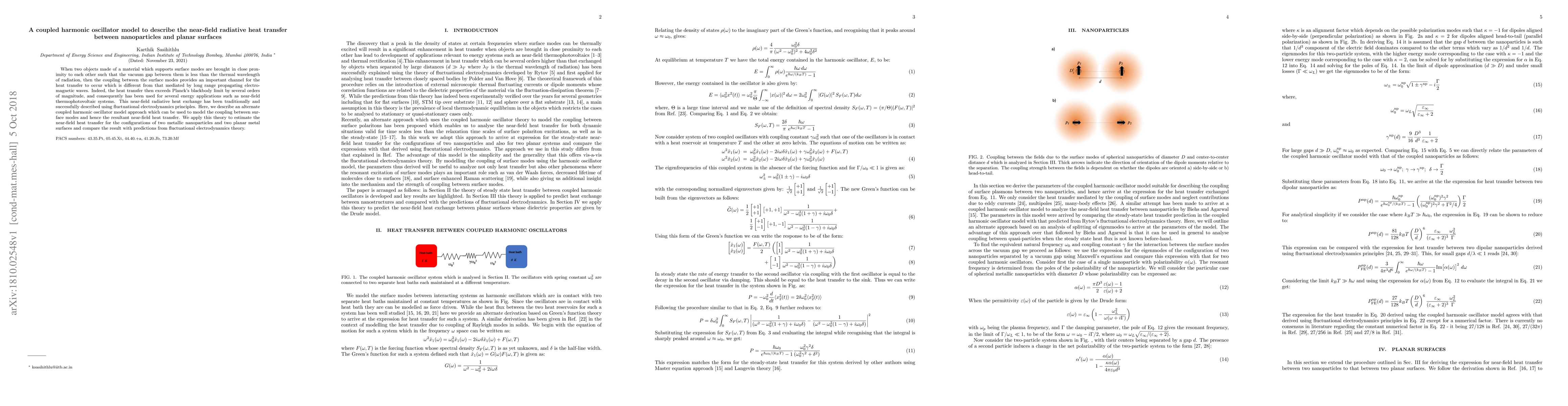 When two objects made of a material which supports surface modes are brought in close proximity to each other such that the vacuum gap between them is less than the thermal wavelength of radiation, then the coupling between the surface modes provides an important channel for the heat transfer to occur which is different from that mediated by long range propagating electromagnetic waves. Indeed, the heat transfer then exceeds Planck's blackbody limit by several orders of magnitude, and consequently has been used for several energy applications such as near-field thermophotovoltaic systems. This near-field radiative heat exchange has been traditionally and successfully described using fluctuational electrodynamics principles. Here, we describe an alternate coupled harmonic oscillator model approach which can be used to model the coupling between surface modes and hence the resultant near-field heat transfer. We apply this theory to estimate the near-field heat transfer for the configurations of two metallic nanoparticles and two planar metal surfaces and compare the result with predictions from fluctuational electrodynamics theory.
