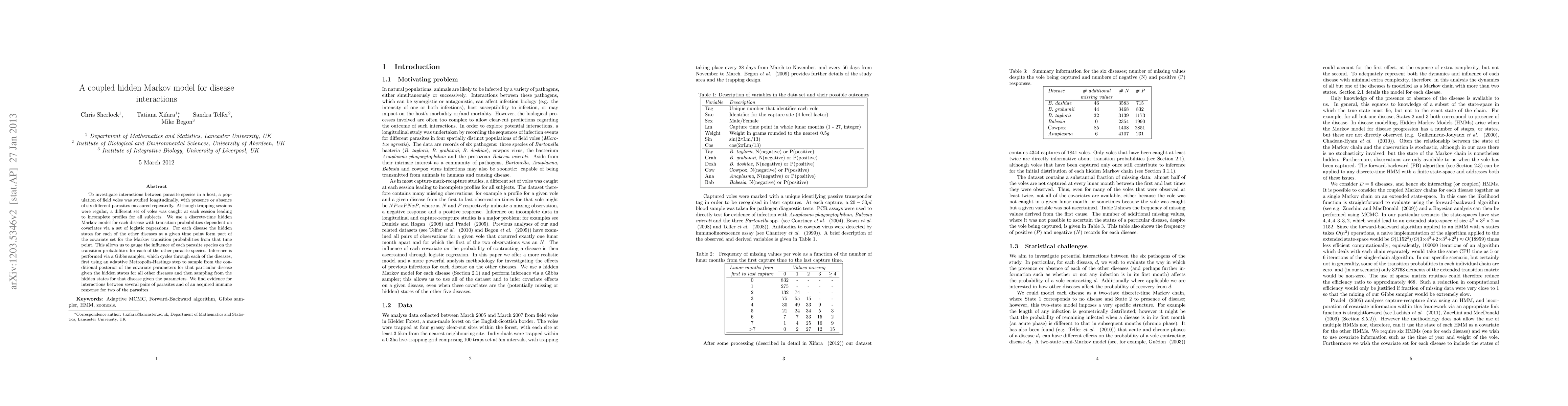 To investigate interactions between parasite species in a host, a population of field voles was studied longitudinally, with presence or absence of six different parasites measured repeatedly. Although trapping sessions were regular, a different set of voles was caught at each session leading to incomplete profiles for all subjects. We use a discrete-time hidden Markov model for each disease with transition probabilities dependent on covariates via a set of logistic regressions. For each disease the hidden states for each of the other diseases at a given time point form part of the covariate set for the Markov transition probabilities from that time point. This allows us to gauge the influence of each parasite species on the transition probabilities for each of the other parasite species. Inference is performed via a Gibbs sampler, which cycles through each of the diseases, first using an adaptive Metropolis-Hastings step to sample from the conditional posterior of the covariate parameters for that particular disease given the hidden states for all other diseases and then sampling from the hidden states for that disease given the parameters. We find evidence for interactions between several pairs of parasites and of an acquired immune response for two of the parasites.