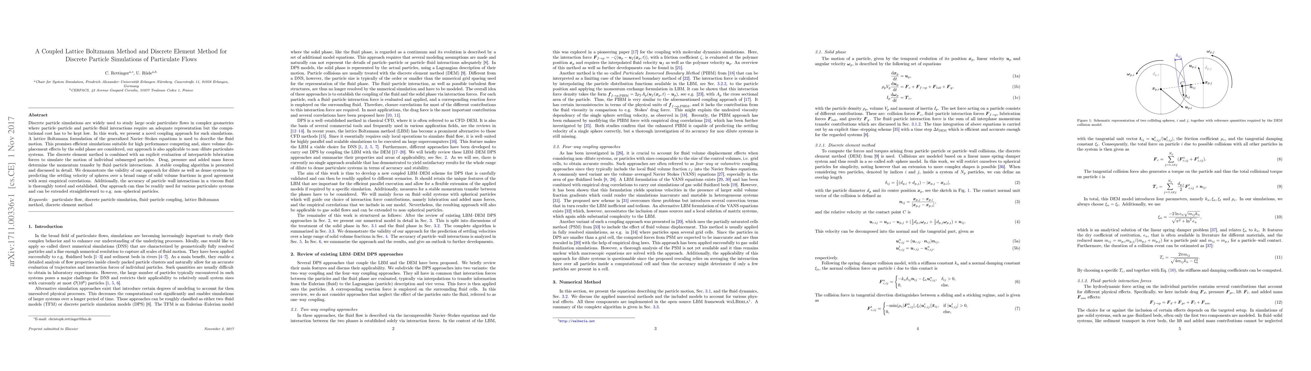 This paper introduces a coupled lattice Boltzmann method and discrete element method for simulating particulate flows, combining fluid dynamics with particle interactions for efficient large-scale simulations. The approach accurately predicts settling velocities and particle-wall interactions, demonstrating its applicability to both dilute and dense particulate systems.