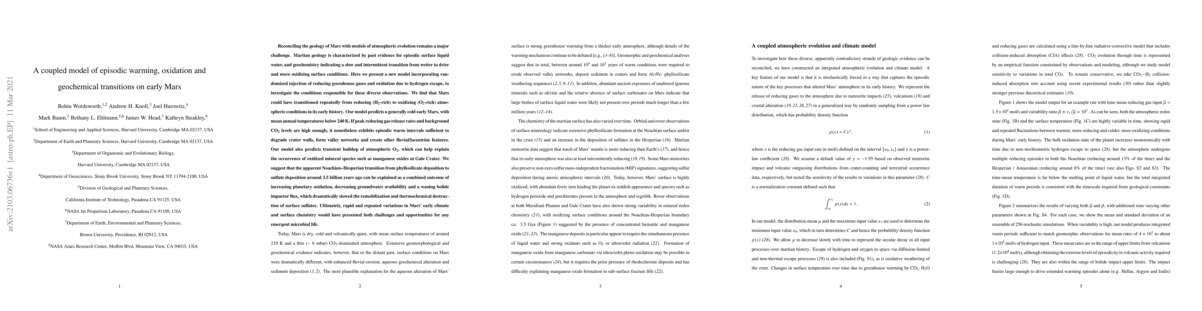 This paper presents a coupled model of episodic warming, oxidation, and geochemical transitions on early Mars, suggesting that Mars experienced repeated transitions from reducing to oxidizing atmospheric conditions. The model predicts cold early Mars with occasional warm intervals, transient O2 buildup, and a transition from phyllosilicate to sulfate deposition due to planetary oxidation and reduced groundwater availability.