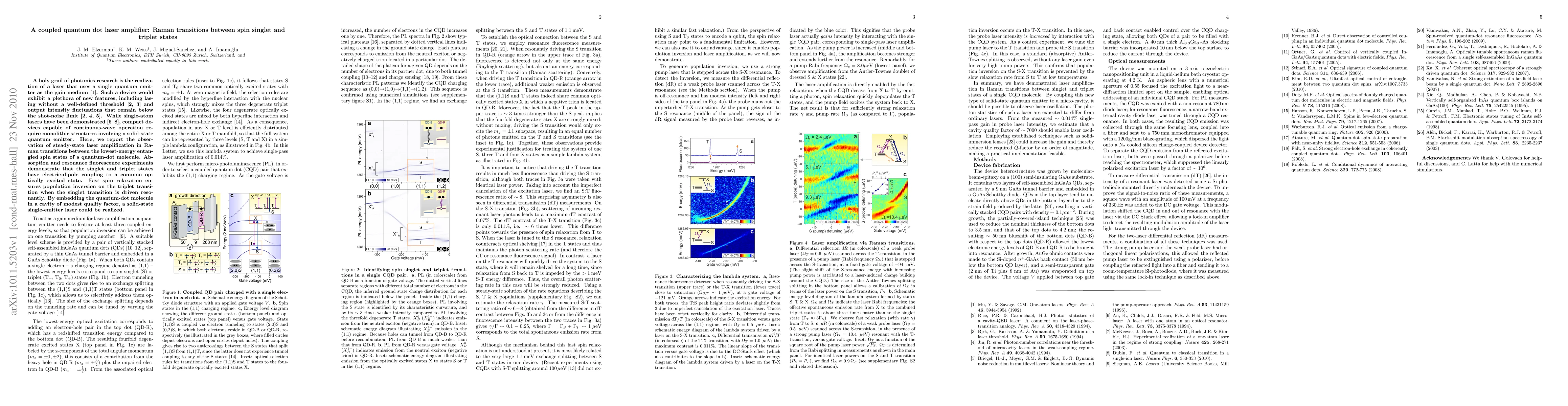 This paper reports the observation of laser amplification in a quantum-dot molecule using Raman transitions between spin singlet and triplet states, demonstrating potential for a compact, continuous-wave single-emitter laser with unique lasing features. The study shows electric-dipole coupling between these states and fast spin relaxation enabling population inversion.