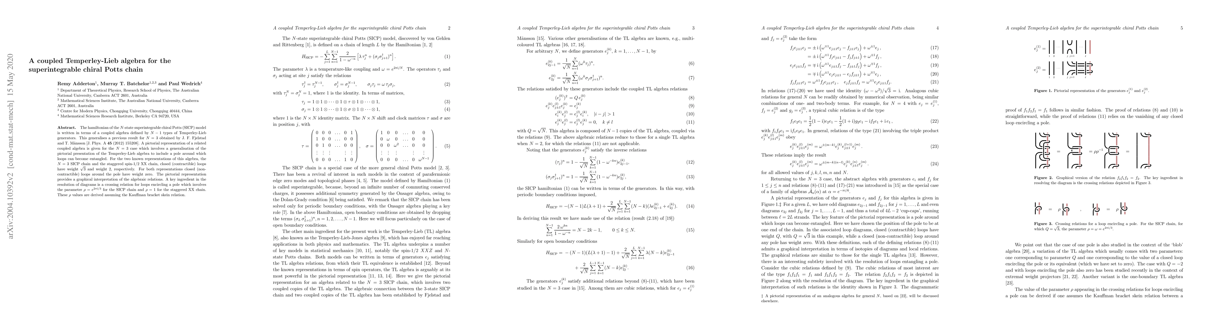 The hamiltonian of the $N$-state superintegrable chiral Potts (SICP) model is written in terms of a coupled algebra defined by $N-1$ types of Temperley-Lieb generators. This generalises a previous result for $N=3$ obtained by J. F. Fjelstad and T. M\r{a}nsson [J. Phys. A {\bf 45} (2012) 155208]. A pictorial representation of a related coupled algebra is given for the $N=3$ case which involves a generalisation of the pictorial presentation of the Temperley-Lieb algebra to include a pole around which loops can become entangled. For the two known representations of this algebra, the $N=3$ SICP chain and the staggered spin-1/2 XX chain, closed (contractible) loops have weight $\sqrt{3}$ and weight $2$, respectively. For both representations closed (non-contractible) loops around the pole have weight zero. The pictorial representation provides a graphical interpretation of the algebraic relations. A key ingredient in the resolution of diagrams is a crossing relation for loops encircling a pole which involves the parameter $\rho= e^{ 2\pi \mathrm{i}/3}$ for the SICP chain and $\rho=1$ for the staggered XX chain. These $\rho$ values are derived assuming the Kauffman bracket skein relation.