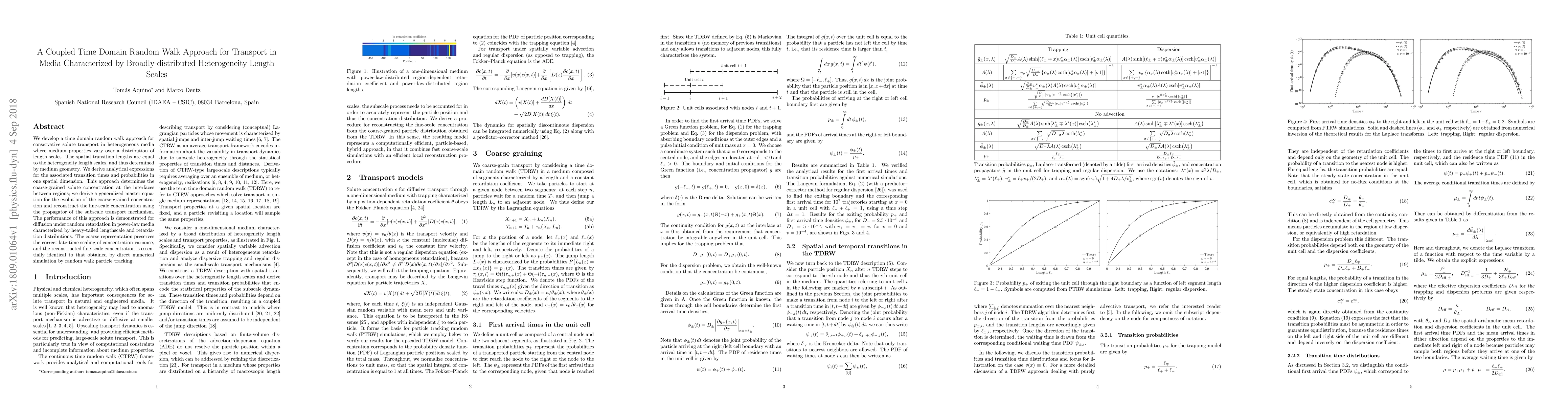 We develop a time domain random walk approach for conservative solute transport in heterogeneous media where medium properties vary over a distribution of length scales. The spatial transition lengths are equal to the heterogeneity length scales, and thus determined by medium geometry. We derive analytical expressions for the associated transition times and probabilities in one spatial dimension. This approach determines the coarse-grained solute concentration at the interfaces between regions; we derive a generalized master equation for the evolution of the coarse-grained concentration and reconstruct the fine-scale concentration using the propagator of the subscale transport mechanism. The performance of this approach is demonstrated for diffusion under random retardation in power-law media characterized by heavy-tailed lengthscale and retardation distributions. The coarse representation preserves the correct late-time scaling of concentration variance, and the reconstructed fine-scale concentration is essentially identical to that obtained by direct numerical simulation by random walk particle tracking.