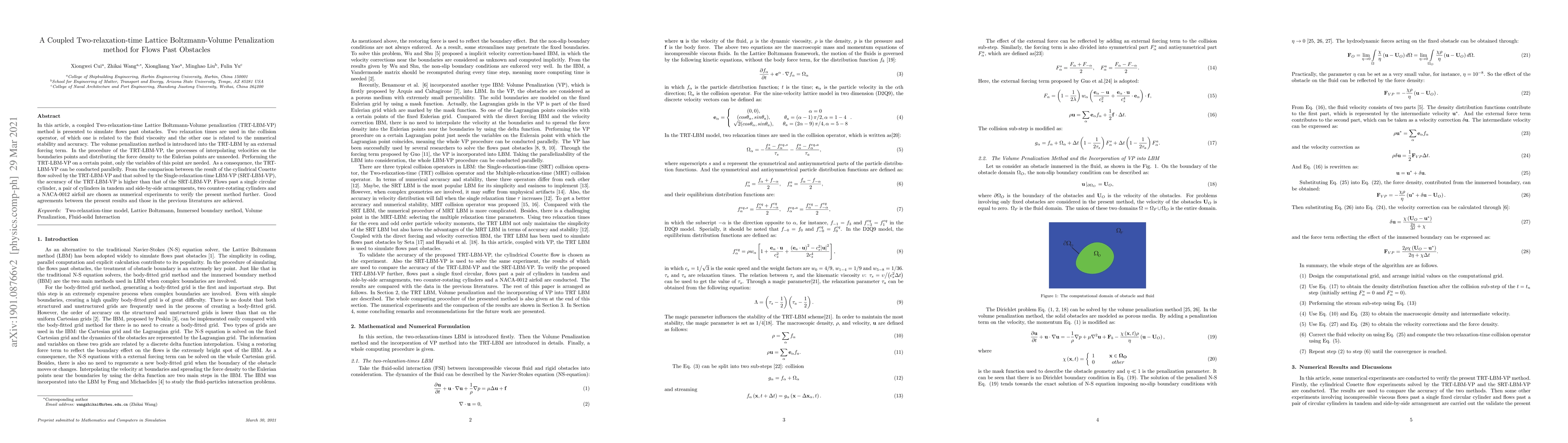 This paper introduces a coupled Two-relaxation-time Lattice Boltzmann-Volume penalization method (TRT-LBM-VP) for simulating fluid flows around obstacles. It demonstrates higher accuracy compared to the Single-relaxation-time LBM-VP and validates the method through various numerical experiments.