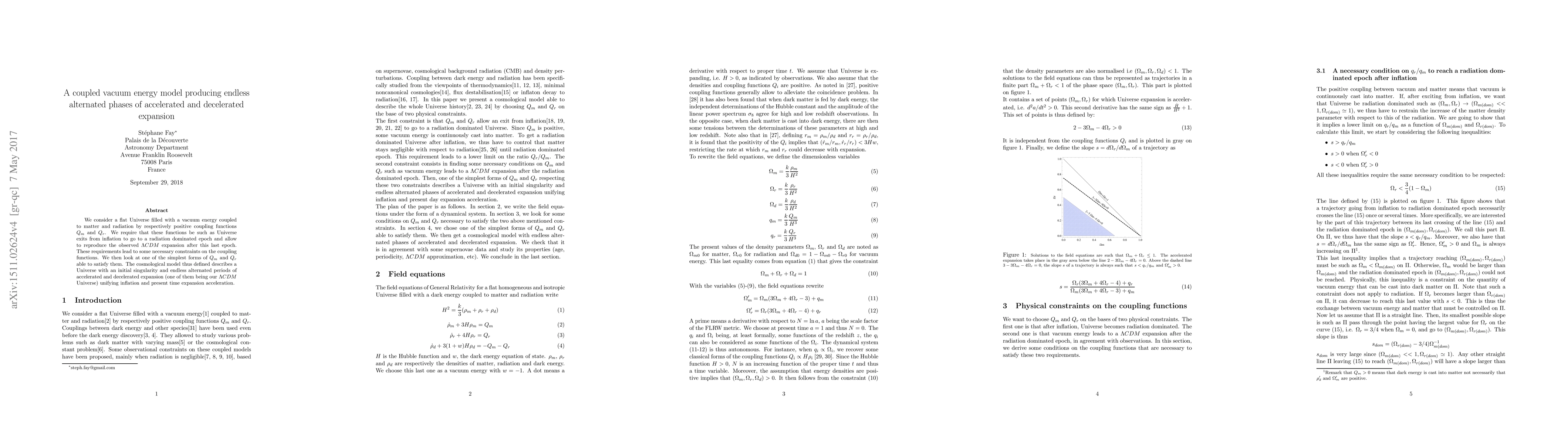 We consider a flat Universe filled with a vacuum energy coupled to matter and radiation by respectively positive coupling functions $Q_m$ and $Q_r$. We require that these functions be such as Universe exits from inflation to go to a radiation dominated epoch and allow to reproduce the observed $\Lambda CDM$ expansion after this last epoch. These requirements lead to some necessary constraints on the coupling functions. We then look at one of the simplest forms of $Q_m$ and $Q_r$ able to satisfy them. The cosmological model thus defined describes a Universe with an initial singularity and endless alternated periods of accelerated and decelerated expansion (one of them being our $\Lambda CDM$ Universe) unifying inflation and present time expansion acceleration.