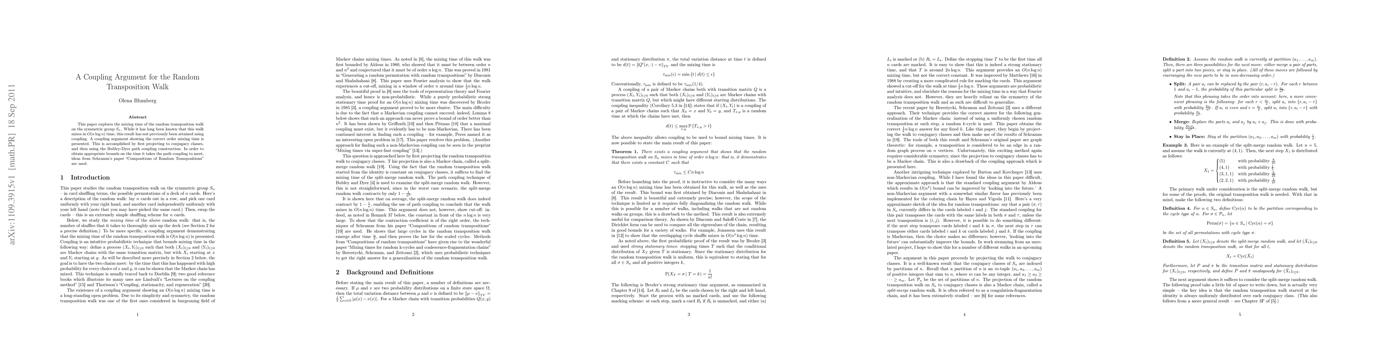 This paper explores the mixing time of the random transposition walk on the symmetric group. While it has long been known that this walk mixes in order n*log(n) time, this result has not previously been attained using coupling. A coupling argument showing the correct order mixing time is presented. This is accomplished by first projecting to conjugacy classes, and then using the Bubley-Dyer path coupling construction. In order to obtain appropriate bounds on the time it takes the path coupling to meet, ideas from Schramm's paper "Compositions of Random Transpositions" are used.