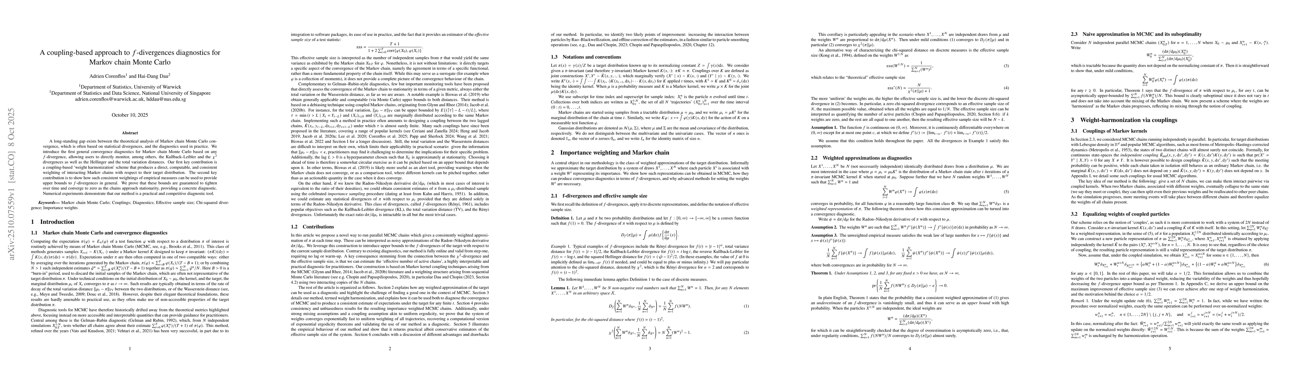 A long-standing gap exists between the theoretical analysis of Markov chain Monte Carlo convergence, which is often based on statistical divergences, and the diagnostics used in practice. We introduce the first general convergence diagnostics for Markov chain Monte Carlo based on any f-divergence, allowing users to directly monitor, among others, the Kullback--Leibler and the $\chi^2$ divergences as well as the Hellinger and the total variation distances. Our first key contribution is a coupling-based `weight harmonization' scheme that produces a direct, computable, and consistent weighting of interacting Markov chains with respect to their target distribution. The second key contribution is to show how such consistent weightings of empirical measures can be used to provide upper bounds to f-divergences in general. We prove that these bounds are guaranteed to tighten over time and converge to zero as the chains approach stationarity, providing a concrete diagnostic. Numerical experiments demonstrate that our method is a practical and competitive diagnostic tool.