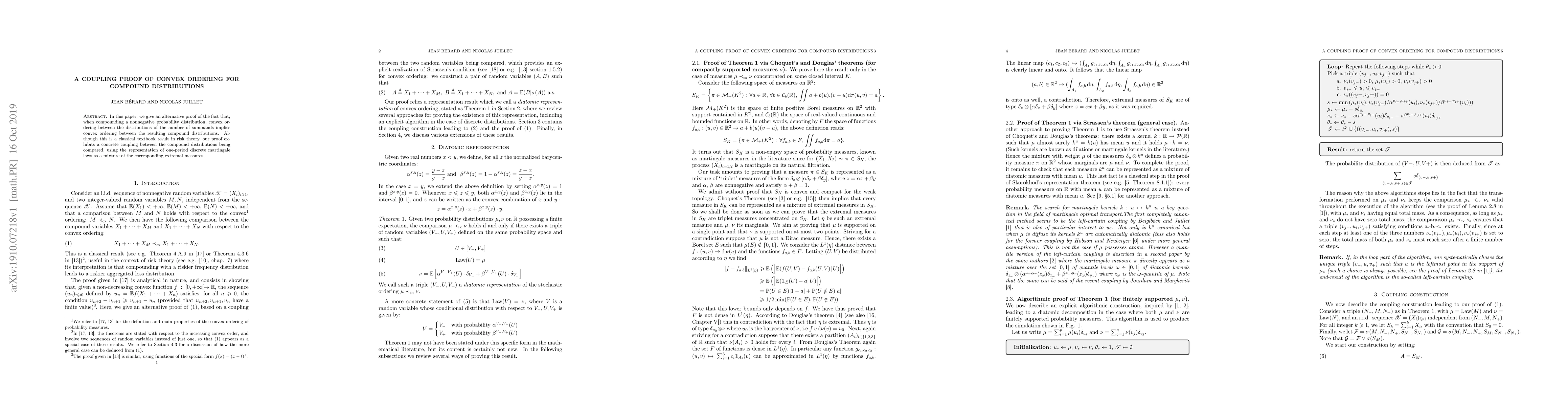 In this paper, we give an alternative proof of the fact that, when compounding a nonnegative probability distribution, convex ordering between the distributions of the number of summands implies convex ordering between the resulting compound distributions. Although this is a classical textbook result in risk theory, our proof exhibits a concrete coupling between the compound distributions being compared, using the representation of one-period discrete martingale laws as a mixture of the corresponding extremal measures.