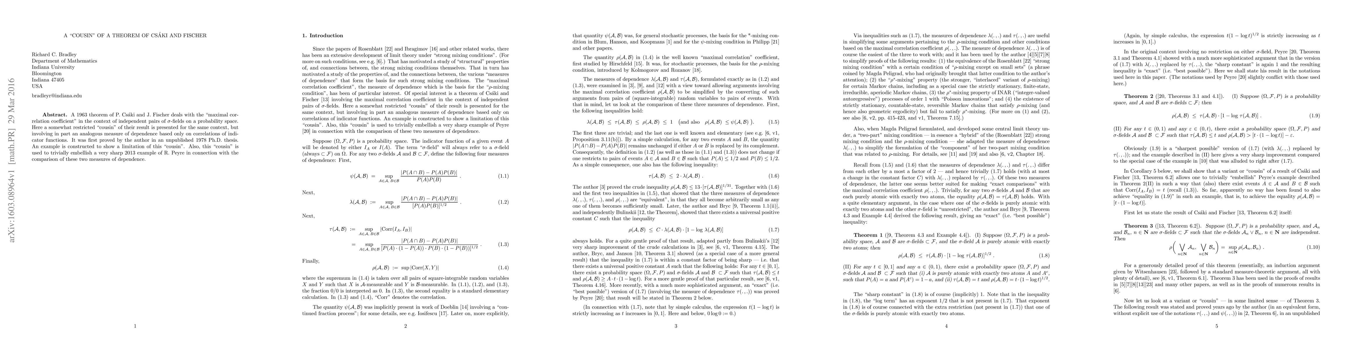 A 1963 theorem of P. Cs\'aki and J. Fischer deals with the "maximal correlation coefficient" in the context of independent pairs of $\sigma$-fields on a probability space. Here a somewhat restricted "cousin" of their result is presented for the same context, but involving in part an analogous measure of dependence based only on correlations of indicator functions. It was first proved by the author in an unpublished 1978 Ph.D. thesis. An example is constructed to show a limitation of this "cousin". Also, this "cousin" is used to trivially embellish a very sharp 2013 example of R. Peyre in connection with the comparison of these two measures of dependence.