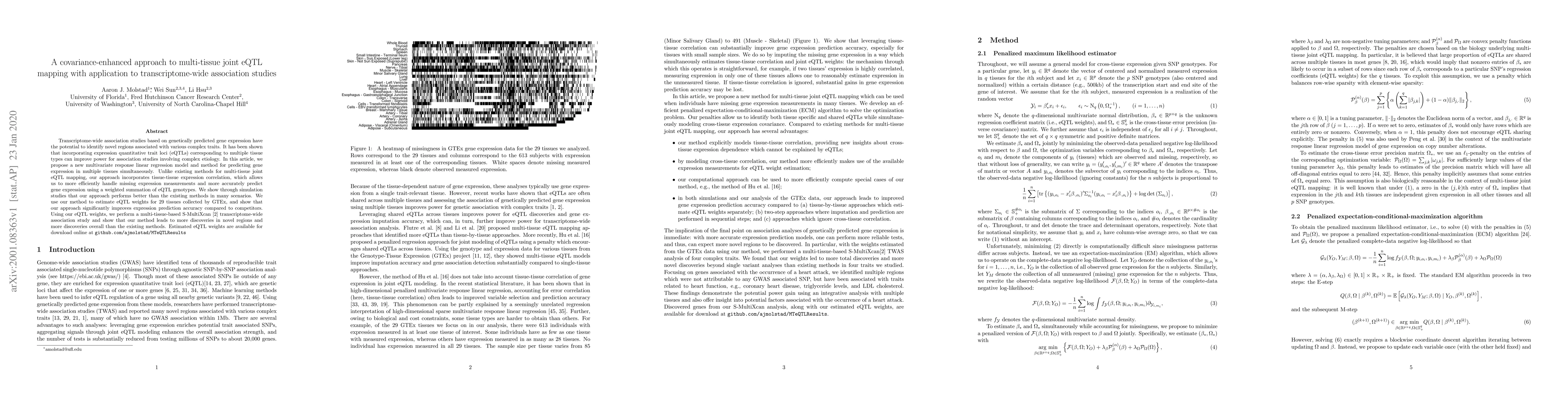 This paper proposes a new multivariate linear regression model to enhance multi-tissue joint eQTL mapping by incorporating tissue-tissue expression correlation, leading to improved prediction accuracy and handling of missing data. The method outperforms existing approaches in simulations and real-world applications, resulting in more discoveries in transcriptome-wide association studies.
