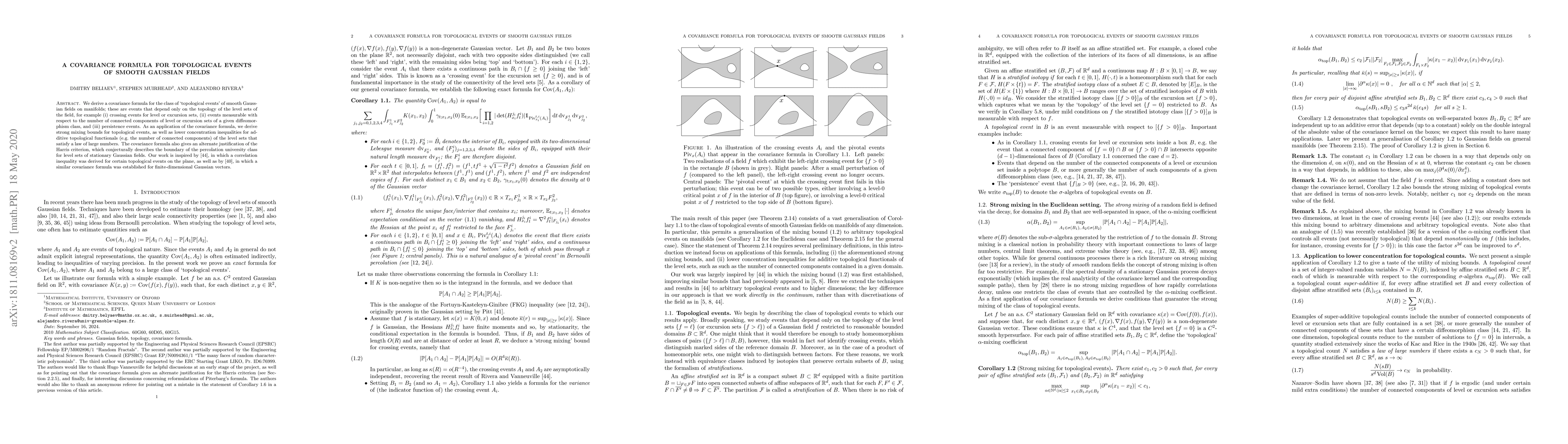 This paper derives a covariance formula for topological events of smooth Gaussian fields on manifolds, providing strong mixing bounds and lower concentration inequalities for these events. The formula also offers a new perspective on the Harris criterion for percolation.