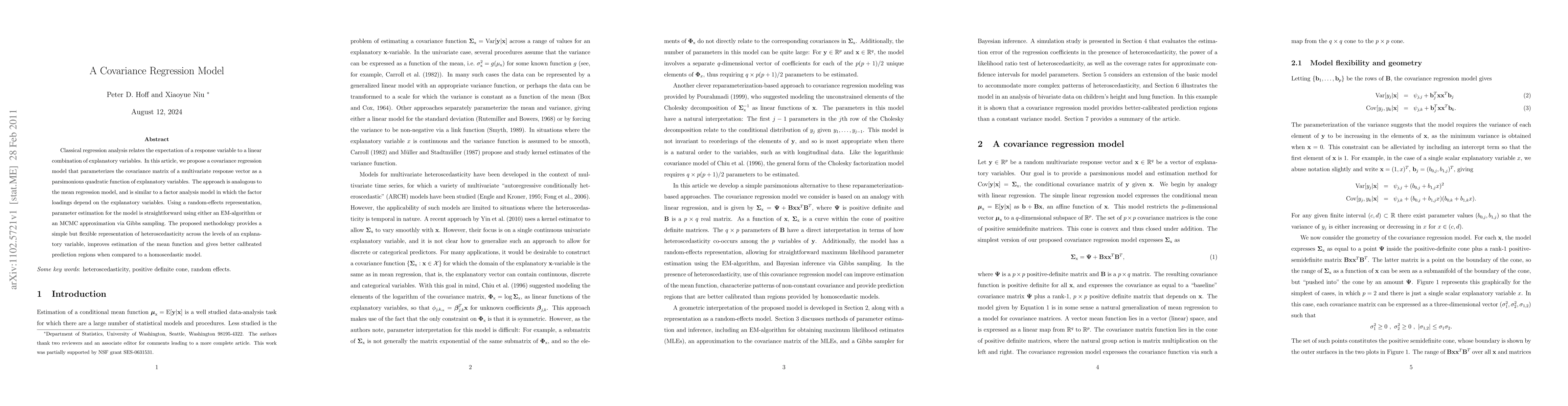 This paper proposes a covariance regression model to parameterize the covariance matrix of a multivariate response vector as a quadratic function of explanatory variables. The method offers a flexible representation of heteroscedasticity, improves mean function estimation, and provides better calibrated prediction regions compared to homoscedastic models.