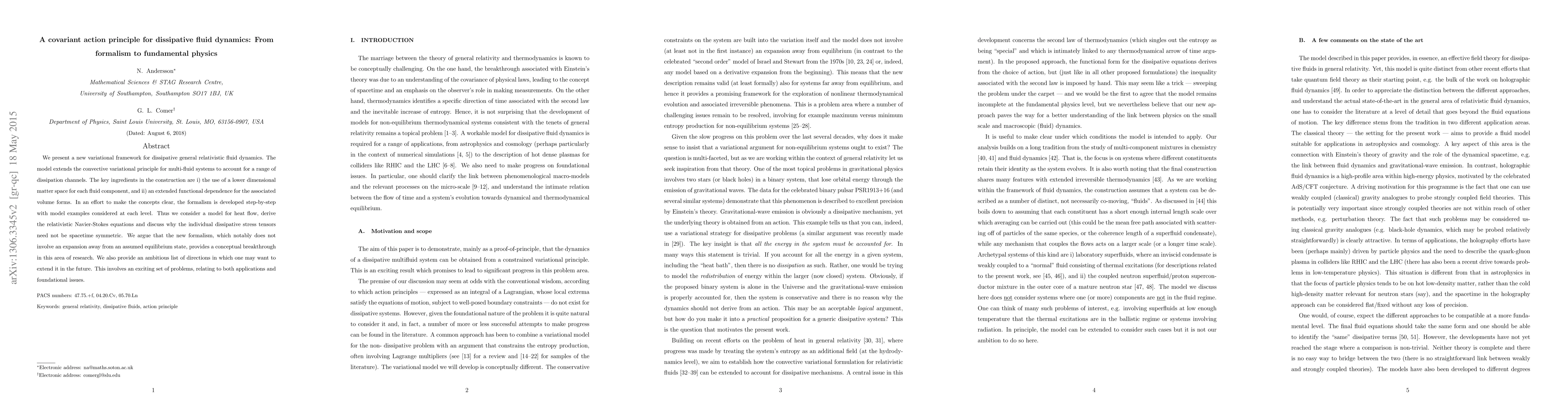 We present a new variational framework for dissipative general relativistic fluid dynamics. The model extends the convective variational principle for multi-fluid systems to account for a range of dissipation channels. The key ingredients in the construction are i) the use of a lower dimensional matter space for each fluid component, and ii) an extended functional dependence for the associated volume forms. In an effort to make the concepts clear, the formalism is developed in steps with the model example of matter coupled to heat considered at each level. Thus we discuss a model for heat flow, derive the relativistic Navier-Stokes equations and discuss why the individual dissipative stress tensors need not be spacetime symmetric. We argue that the new formalism, which notably does not involve an expansion away from an assumed equilibrium state, provides a conceptual breakthrough in this area of research and provide an ambitious list of directions in which one may want to extend it in the future. This involves an exciting set of problems, relating to both applications and foundational issues.