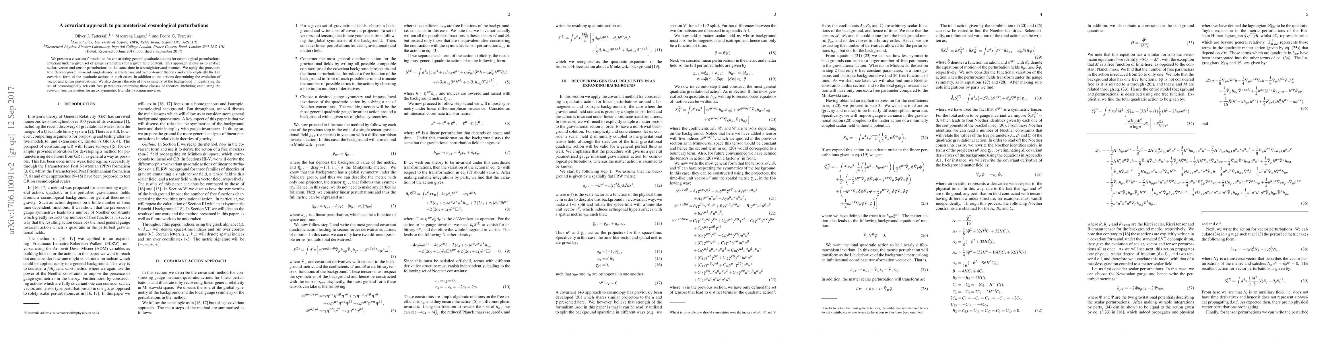 We present a covariant formulation for constructing general quadratic actions for cosmological perturbations, invariant under a given set of gauge symmetries for a given field content. This approach allows us to analyse scalar, vector and tensor perturbations at the same time in a straightforward manner. We apply the procedure to diffeomorphism invariant single-tensor, scalar-tensor and vector-tensor theories and show explicitly the full covariant form of the quadratic actions in such cases, in addition to the actions determining the evolution of vector and tensor perturbations. We also discuss the role of the symmetry of the background in identifying the set of cosmologically relevant free parameters describing these classes of theories, including calculating the relevant free parameters for an axisymmetric Bianchi-I vacuum universe.