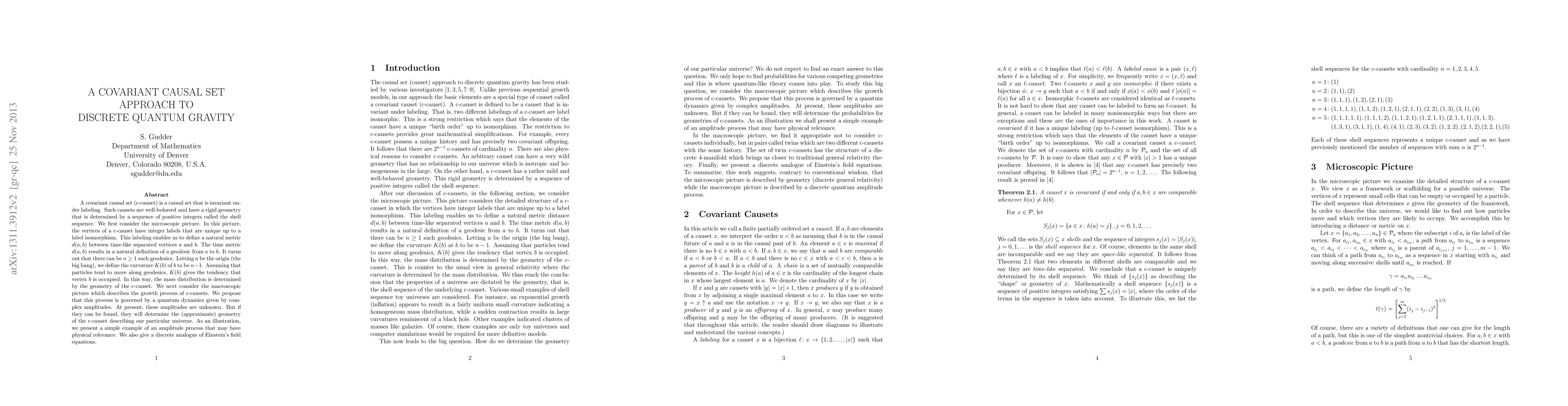This paper proposes a covariant causal set approach to discrete quantum gravity, suggesting that the geometry of the universe is determined by a sequence of positive integers and that particles tend to move along geodesics, which can be used to describe mass distribution.