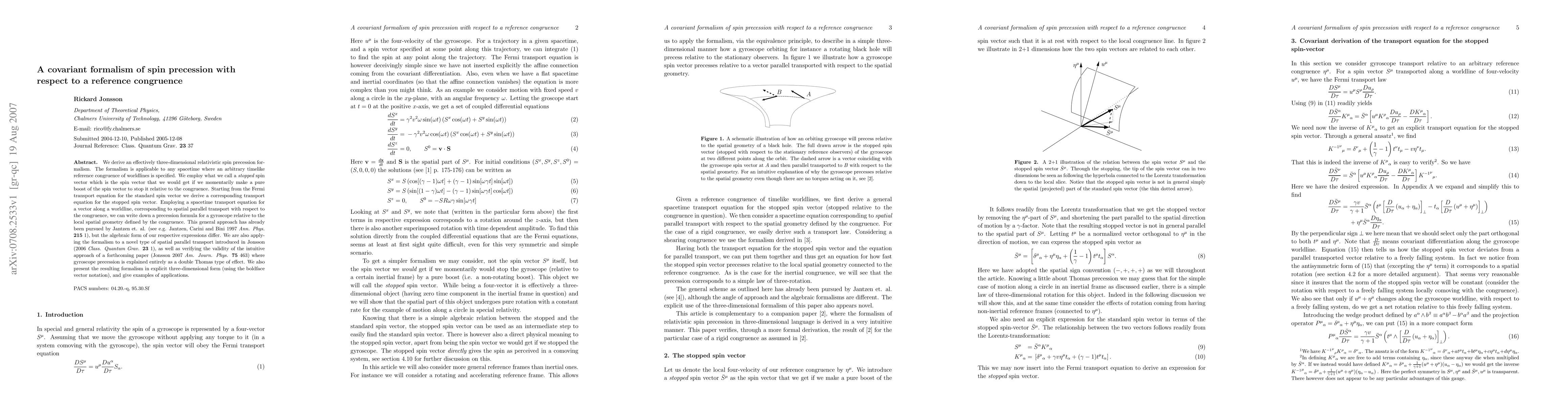 We derive an effectively three-dimensional relativistic spin precession formalism. The formalism is applicable to any spacetime where an arbitrary timelike reference congruence of worldlines is specified. We employ what we call a stopped spin vector which is the spin vector that we would get if we momentarily make a pure boost of the spin vector to stop it relative to the congruence. Starting from the Fermi transport equation for the standard spin vector we derive a corresponding transport equation for the stopped spin vector. Employing a spacetime transport equation for a vector along a worldline, corresponding to spatial parallel transport with respect to the congruence, we can write down a precession formula for a gyroscope relative to the local spatial geometry defined by the congruence. This general approach has already been pursued by Jantzen et. al. (see e.g. Jantzen, Carini and Bini, Ann. Phys. 215 (1997) 1), but the algebraic form of our respective expressions differ. We are also applying the formalism to a novel type of spatial parallel transport introduced in Jonsson (Class. Quantum Grav. 23 (2006) 1), as well as verifying the validity of the intuitive approach of a forthcoming paper (Jonsson, Am. Journ. Phys. 75 (2007) 463) where gyroscope precession is explained entirely as a double Thomas type of effect. We also present the resulting formalism in explicit three-dimensional form (using the boldface vector notation), and give examples of applications.