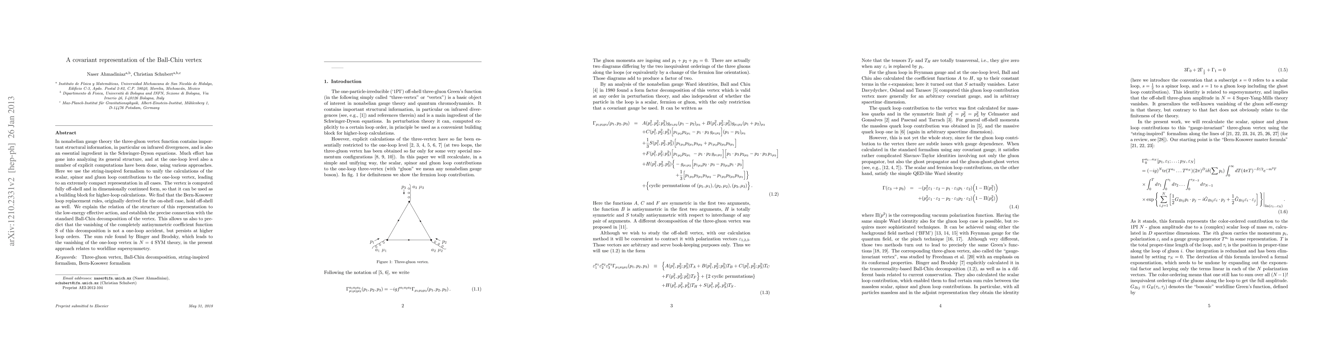 This paper presents a covariant representation of the Ball-Chiu vertex in nonabelian gauge theory, using a string-inspired formalism to unify scalar, spinor, and gluon loop contributions at the one-loop level. The vertex is computed off-shell and dimensionally continued, confirming the applicability of Bern-Kosower rules and predicting the persistence of certain properties at higher loop orders.