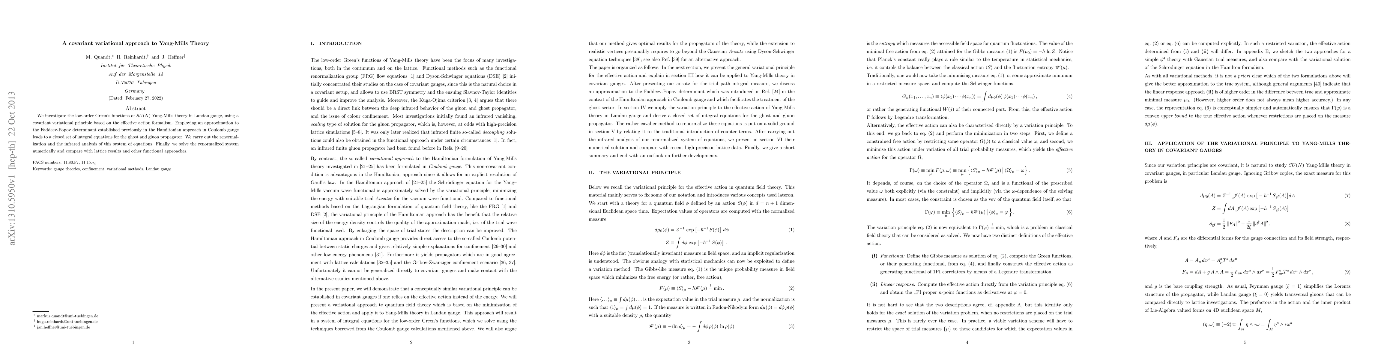 This paper employs a covariant variational principle to study the low-order Green's functions of SU(N) Yang-Mills theory in Landau gauge, deriving a closed set of equations for ghost and gluon propagators. It also performs renormalization and infrared analysis, and compares numerical results with lattice and other functional approaches.