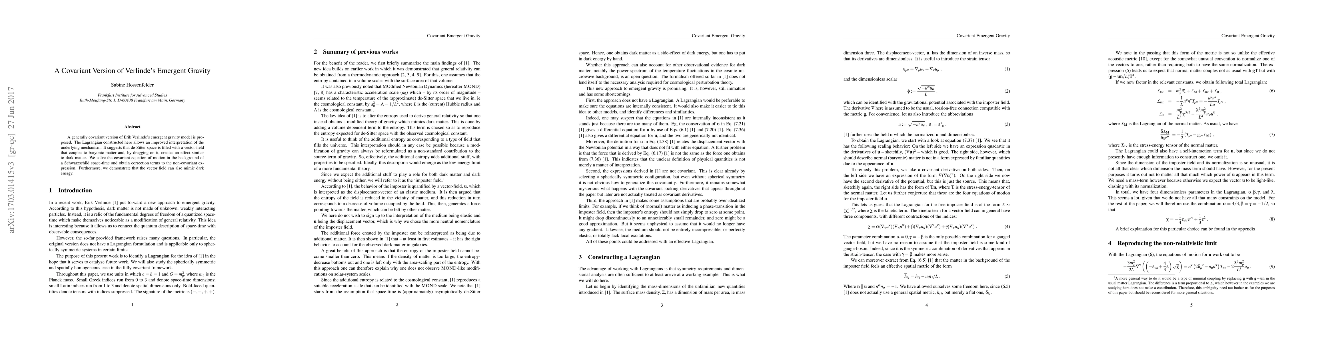 This paper proposes a covariant version of Verlinde's emergent gravity model, suggesting a vector field in de-Sitter space that mimics dark matter and dark energy effects by coupling to baryonic matter. The study derives correction terms for the covariant equation of motion in Schwarzschild space-time.