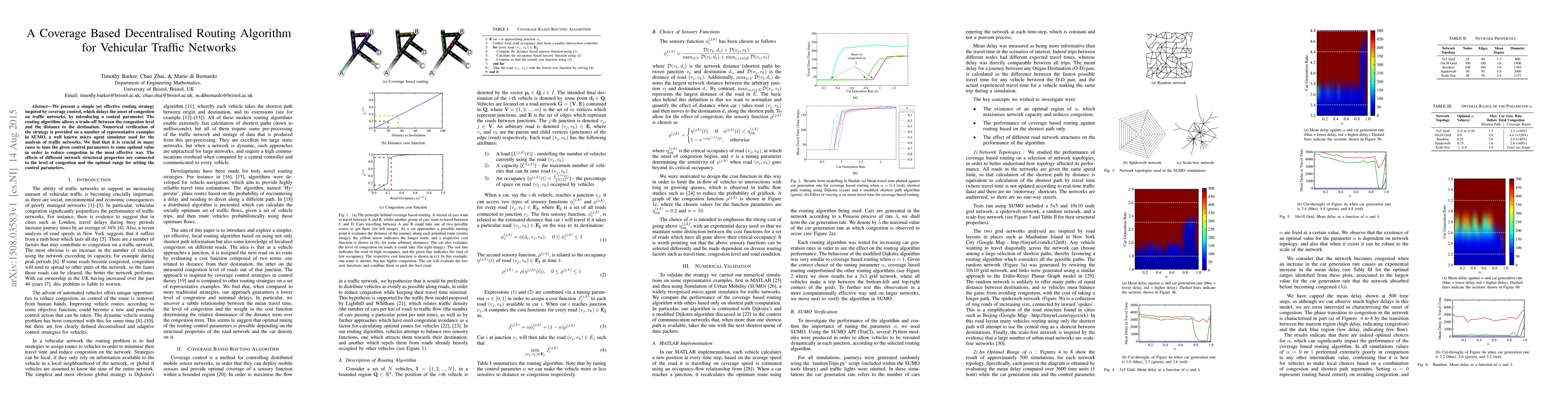 A new decentralized routing algorithm for vehicular traffic networks is proposed, which uses a control parameter to balance congestion levels and distance to destination, with optimal parameter values crucial for effective congestion reduction.