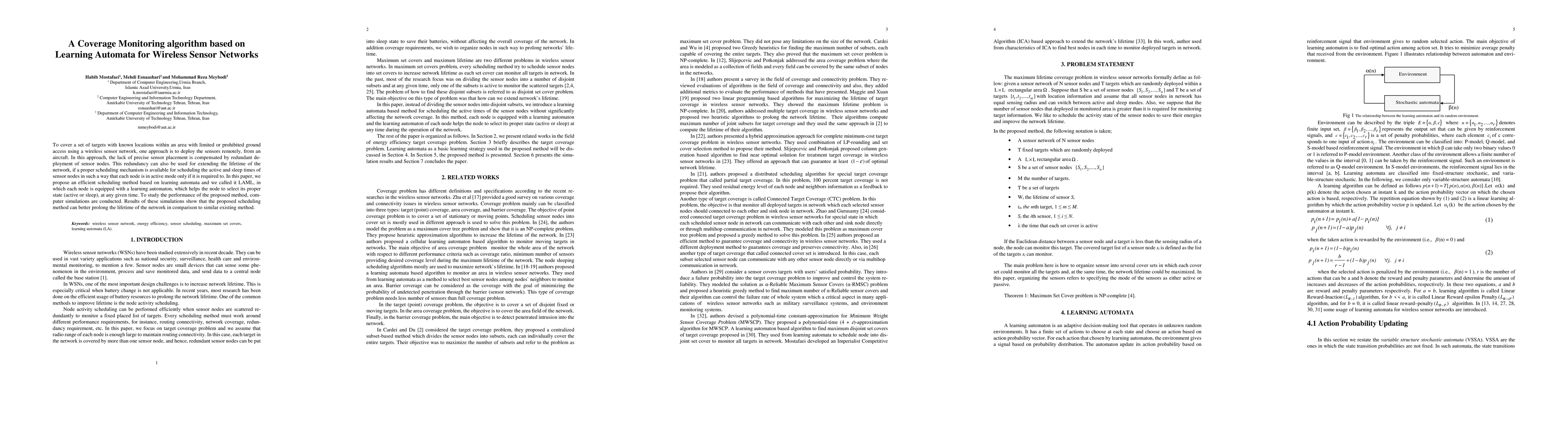 This paper proposes LAML, a coverage monitoring algorithm for wireless sensor networks using learning automata to optimize the active and sleep scheduling of nodes, thereby extending network lifetime. Simulation results demonstrate that LAML outperforms existing methods in prolonging network longevity.