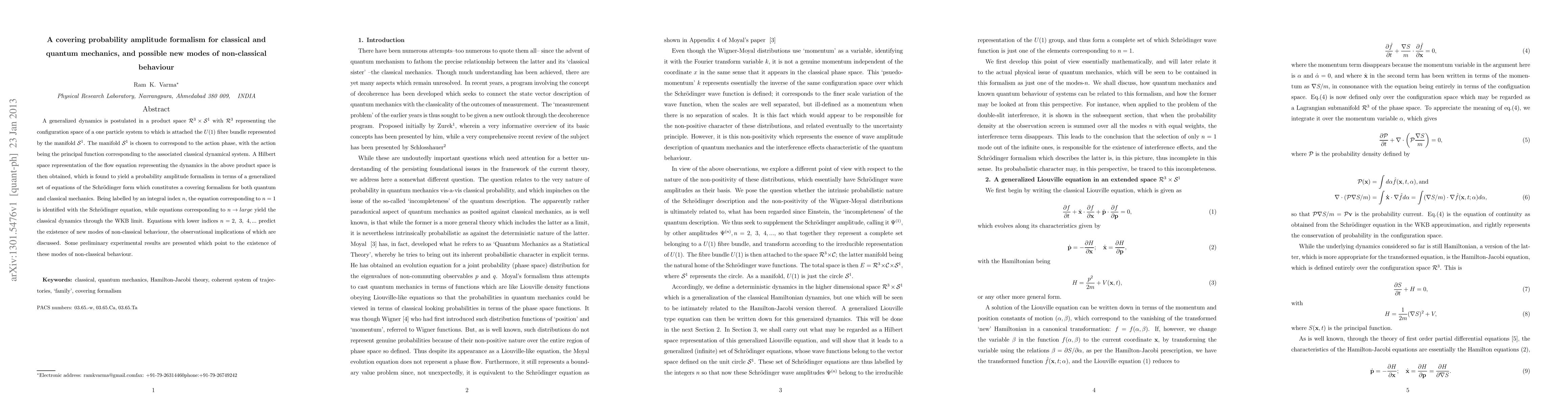 A generalized dynamics is postulated in a product space ${\cal R}^{3}\times {\cal S}^{1}$ with ${\cal R}^3$ representing the configuration space of a one particle system to which is attached the U(1) fibre bundle represented by the manifold ${\cal S}^{1}$. The manifold ${\cal S}^{1}$ is chosen to correspond to the action phase, with the action being the principal function corresponding to the associated classical dynamical system. A Hilbert space representation of the flow equation representing the dynamics in the above product space is then obtained, which is found to yield a probability amplitude formalism in terms of a generalized set of equations of the Schr\"odinger form which constitutes a covering formalism for both quantum and classical mechanics. Being labelled by an integral index $n$, the equation corresponding to $n=1$ is identified with the Schr\"odinger equation, while equations corresponding to $n\rightarrow large$ yield the classical dynamics through the WKB limit. Equations with lower indices n=2,3,4,... predict the existence of new modes of non-classical behaviour, the observational implications of which are discussed. Some preliminary experimental results are presented which point to the existence of these modes of non-classical behaviour.