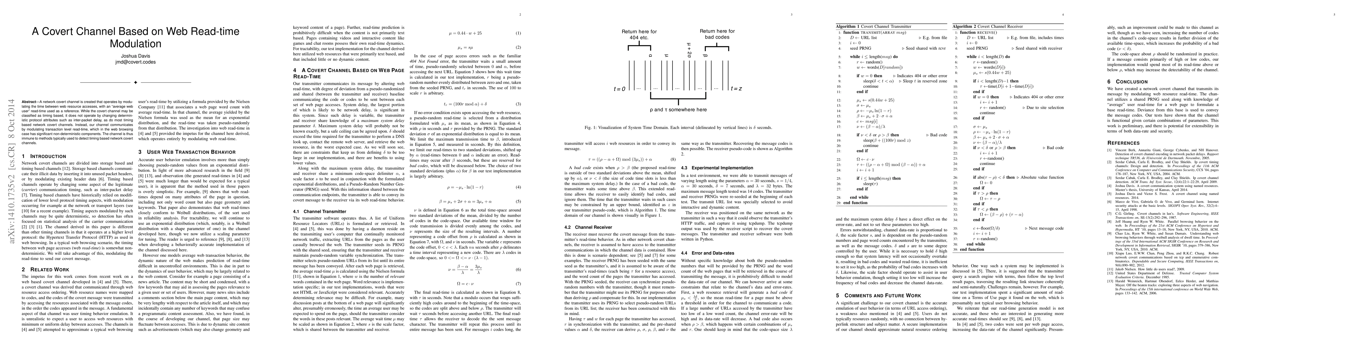 This paper introduces a covert channel that modulates the time between web resource accesses based on average user read-time, differing from traditional timing-based channels by using non-deterministic transaction-level read-time. This method is less detectable by conventional timing-based covert channel detection techniques.