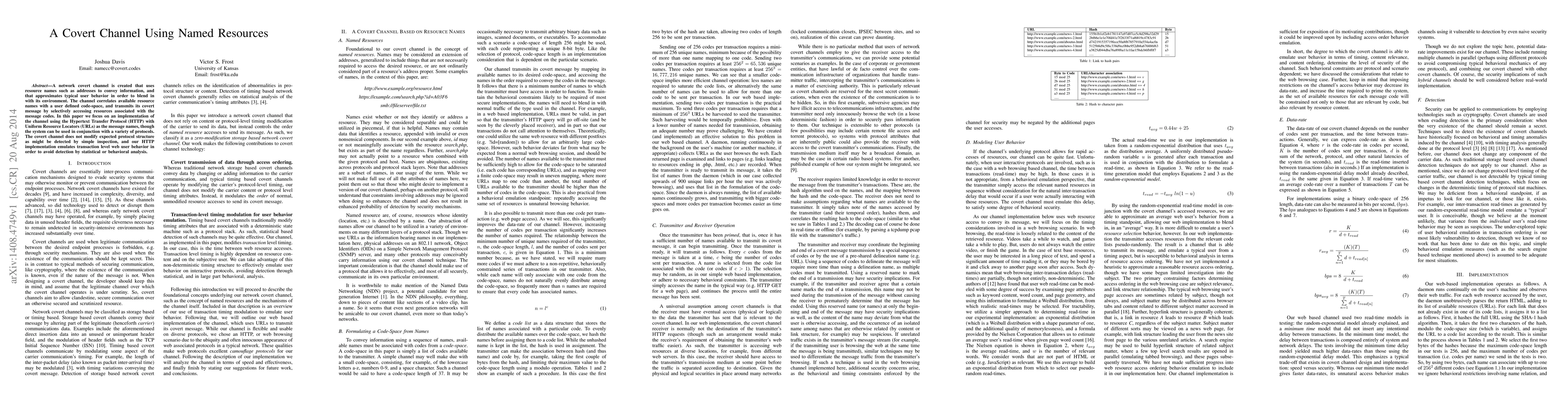 A network covert channel is created that uses resource names such as addresses to convey information, and that approximates typical user behavior in order to blend in with its environment. The channel correlates available resource names with a user defined code-space, and transmits its covert message by selectively accessing resources associated with the message codes. In this paper we focus on an implementation of the channel using the Hypertext Transfer Protocol (HTTP) with Uniform Resource Locators (URLs) as the message names, though the system can be used in conjunction with a variety of protocols. The covert channel does not modify expected protocol structure as might be detected by simple inspection, and our HTTP implementation emulates transaction level web user behavior in order to avoid detection by statistical or behavioral analysis.