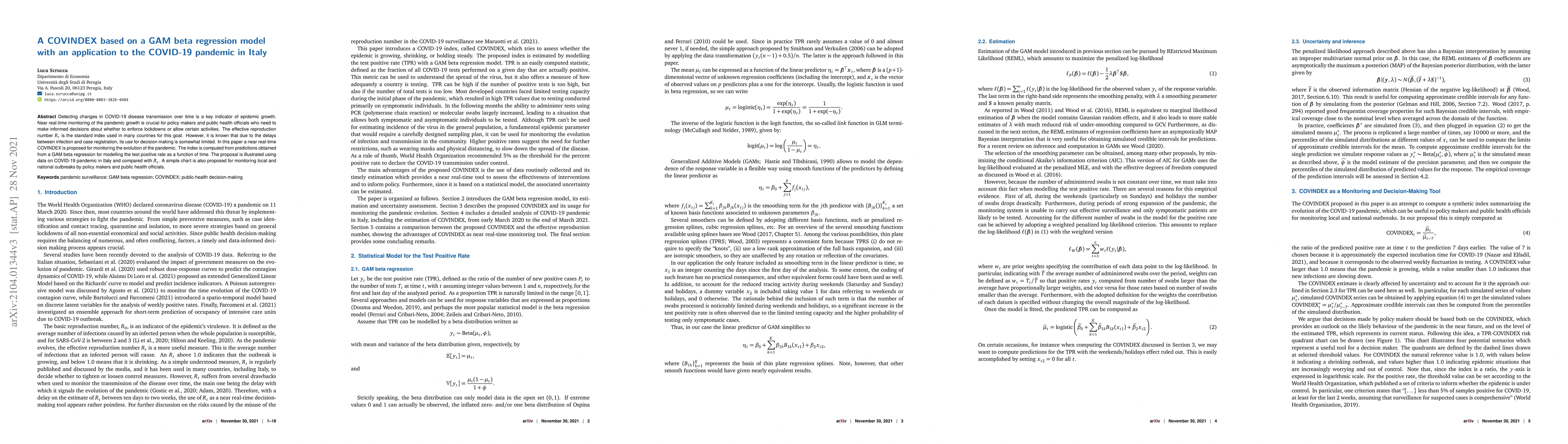 Detecting changes in COVID-19 disease transmission over time is a key indicator of epidemic growth.Near real-time monitoring of the pandemic growth is crucial for policy makers and public health officials who need to make informed decisions about whether to enforce lockdowns or allow certain activities. The effective reproduction number Rt is the standard index used in many countries for this goal. However, it is known that due to the delays between infection and case registration, its use for decision making is somewhat limited. In this paper a near real-time COVINDEX is proposed for monitoring the evolution of the pandemic. The index is computed from predictions obtained from a GAM beta regression for modelling the test positive rate as a function of time. The proposal is illustrated using data on COVID-19 pandemic in Italy and compared with Rt. A simple chart is also proposed for monitoring local and national outbreaks by policy makers and public health officials.