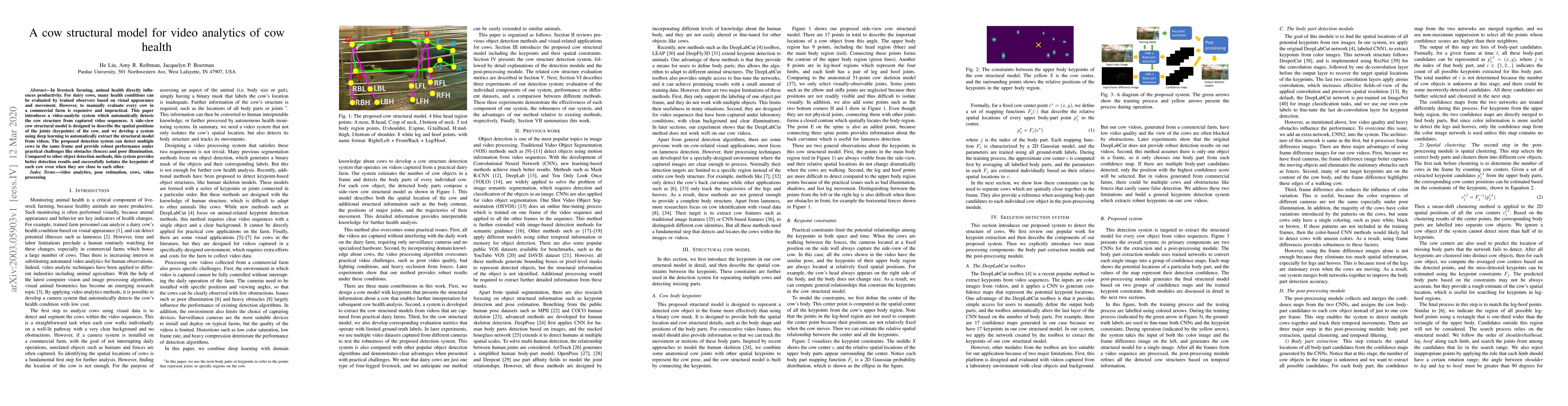 This paper presents a video-analytic system using deep learning to automatically detect cow structures from video sequences, enabling efficient health monitoring in dairy farms by identifying key joint positions in a side-view cow structural model, even in challenging conditions. The system outperforms other detection methods by accurately isolating cow keypoints even when cows are close together.